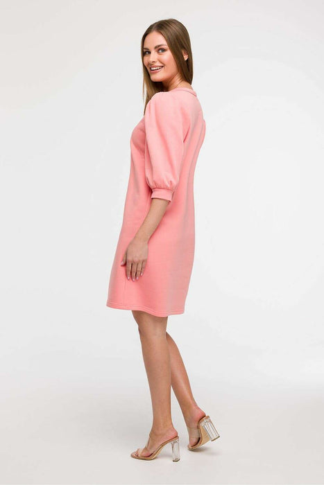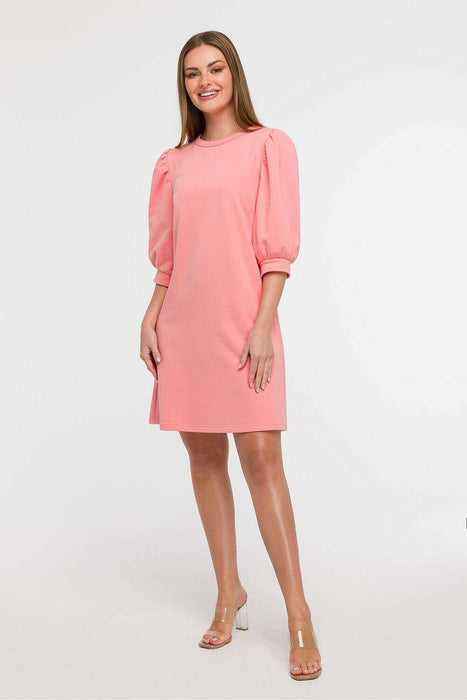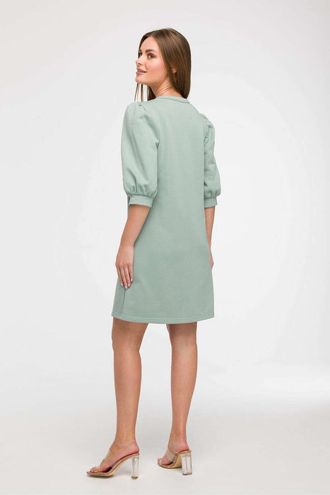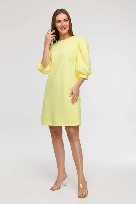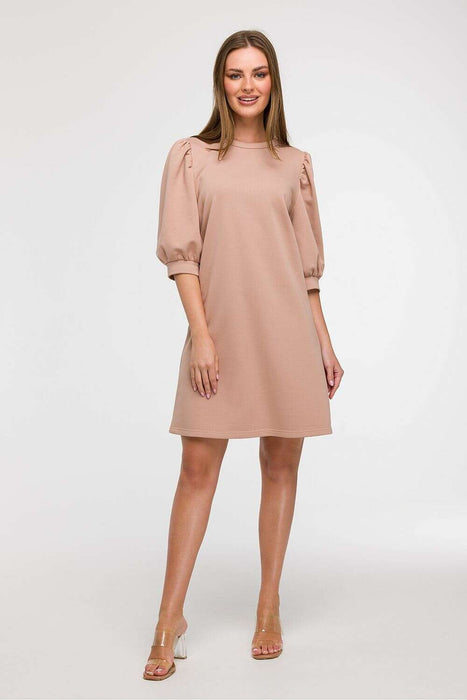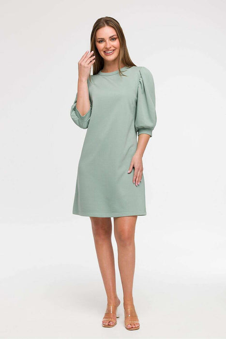 Light and stylish dress with a loose, unadjusted cut is the perfect choice for everyday wear, it will work well during holiday trips as well as city walks. Made in Poland, with comfort and feminine style in mind, it enchants with a subtle A-line cut that gently widens towards the bottom, providing freedom of movement. The dress reaches just above the knee, has a round neckline under the neck and eye-catching 3/4 sleeves, puffy cut with gathering and cuff finishing adds a romantic character to the whole. The lack of lining makes the model airy and light, perfect for warmer days. Thanks to its cut, the dress fits many types of silhouettes, and looks particularly good on a Y figure, the flared bottom balances the proportions between the shoulders and hips.
