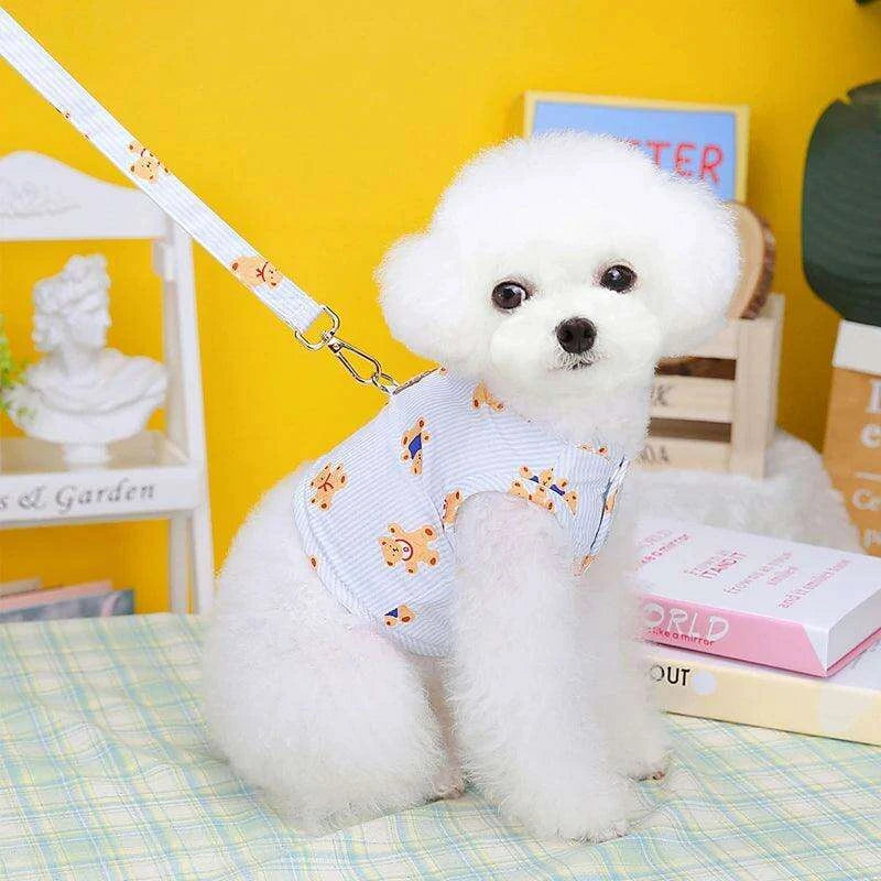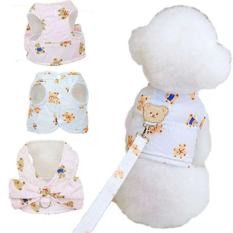 Cute Bear Pattern Mesh Dog Harness and Bowtie Leash Set for Small Pets - Stylish Vest for Dogs and Cats