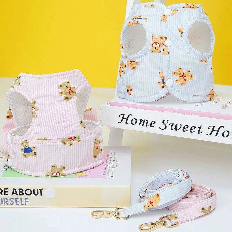 Adorable Bear Print Mesh Harness and Bowtie Leash Combo for Small Dogs and Cats - Trendy Pet Vest - Très Elite