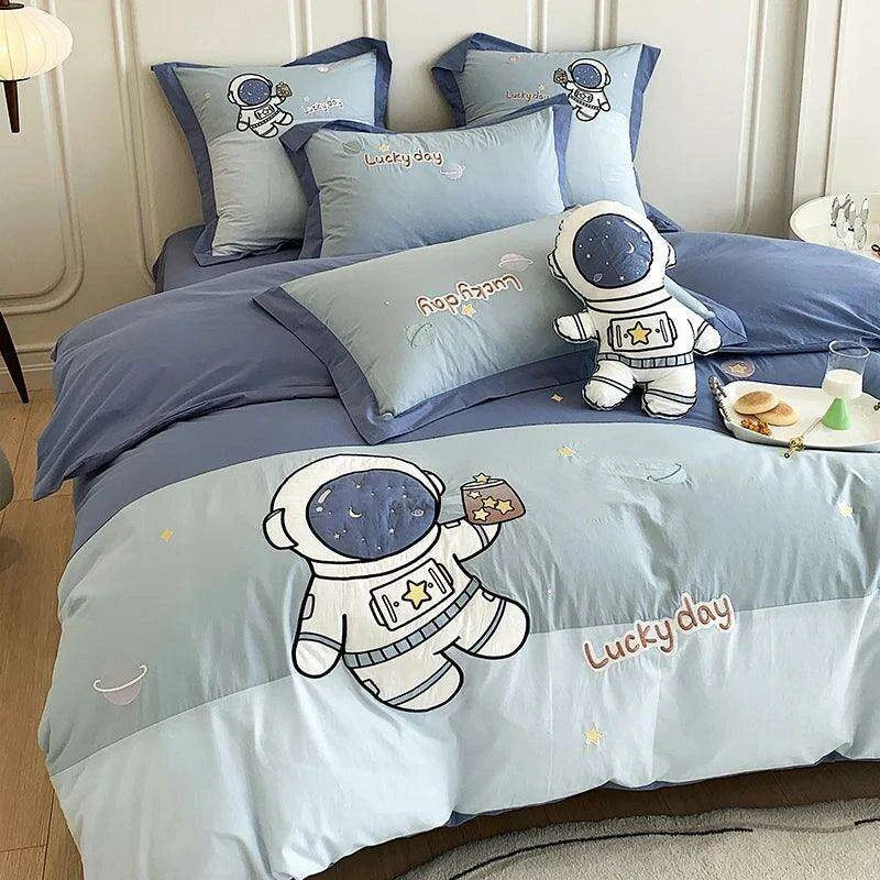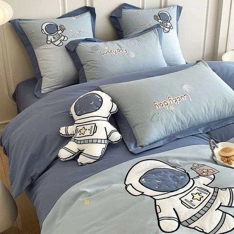 Charming Blue Cartoon Astronaut Embroidered 100% Cotton Boys Bedding Set - Single Duvet Cover, Sheet & Pillowcases - Ideal Gift for Little Explorers- Très Elite- Très Elite