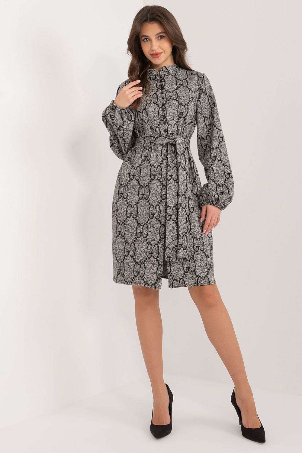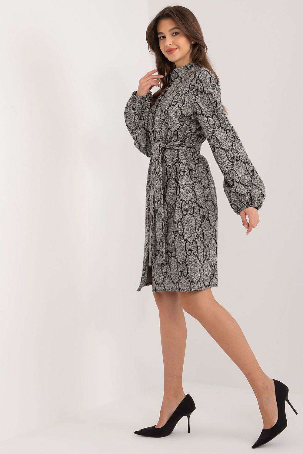 Featuring long sleeves and a refined stand-up collar, the Elegant Knit Dress is accentuated by: