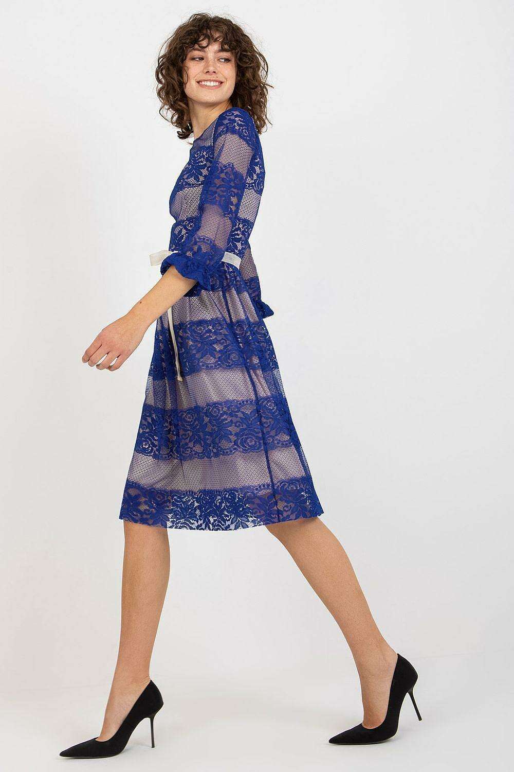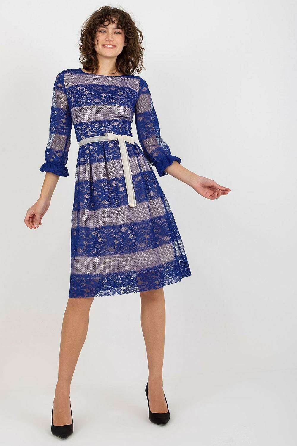Chic Lace Evening Dress with 3/4 Sleeves and Adjustable Waist Sash