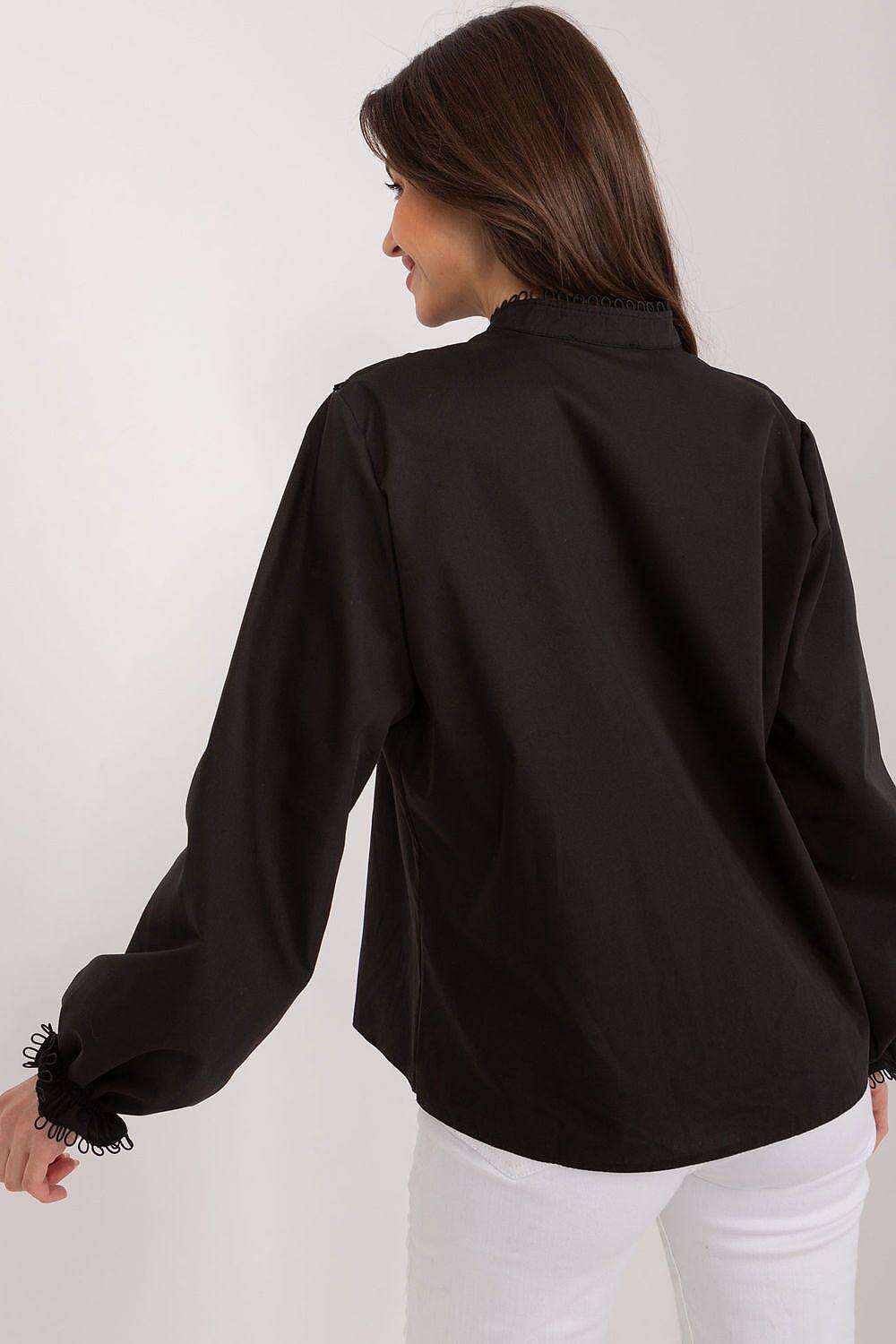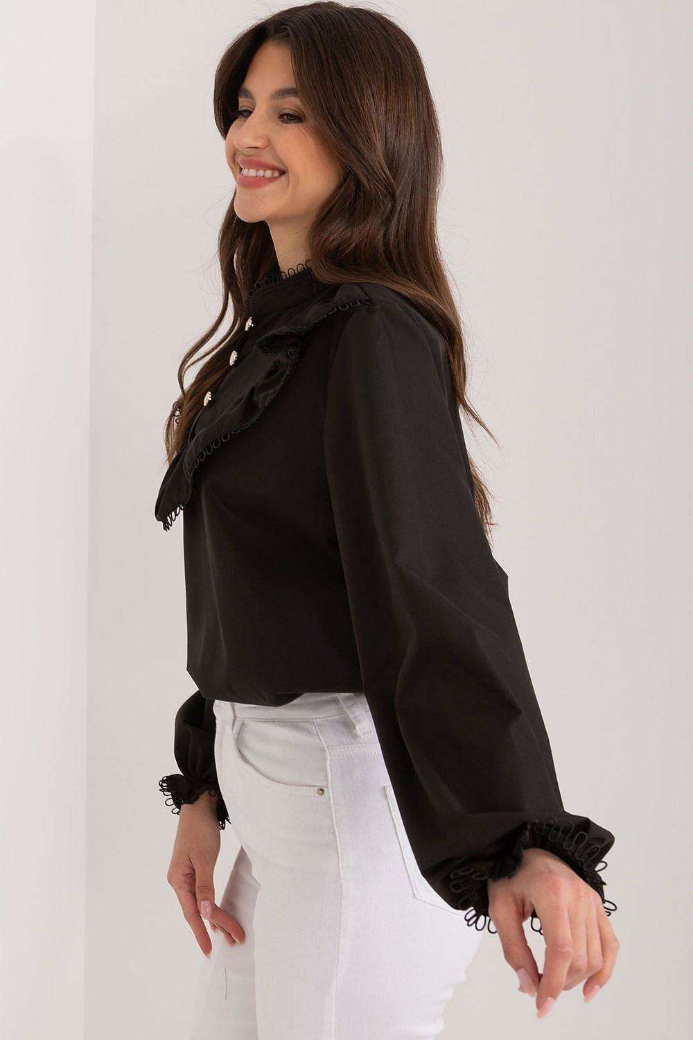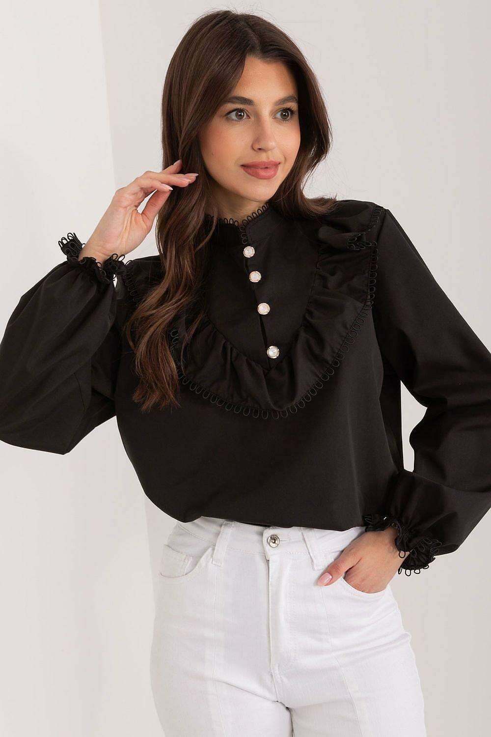 - Unique Details: A decorative ruffle on the front adds a touch of femininity and charm, enhancing the blouse's appeal.