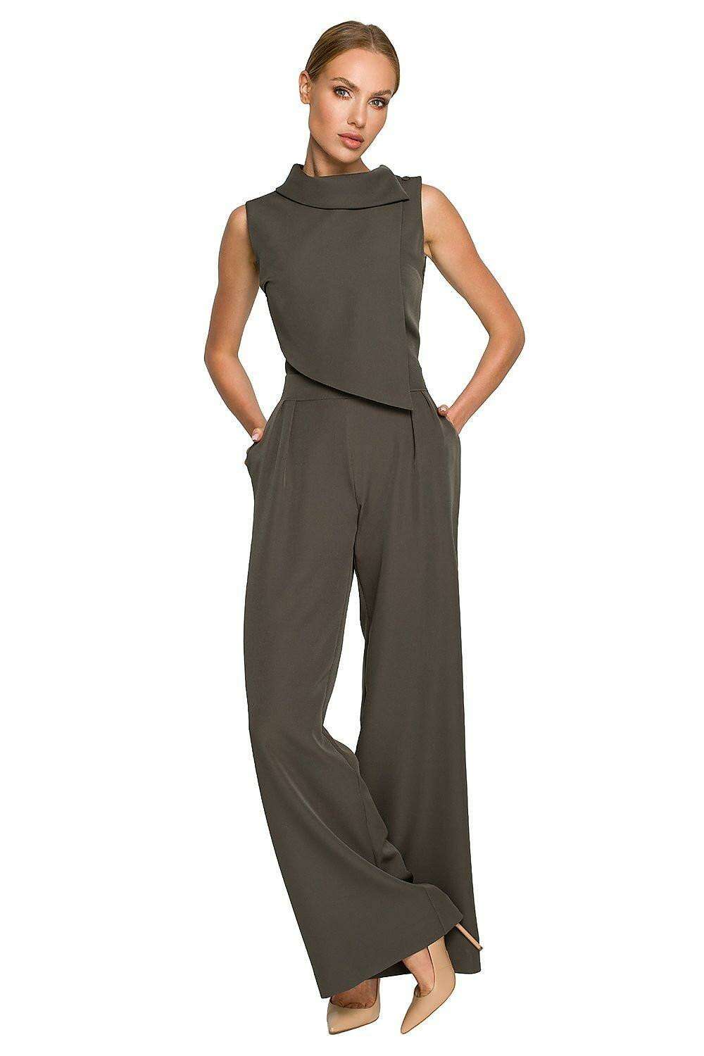 Elegant Wide-Leg Jumpsuit with Roll-Up Collar and Decorative Details