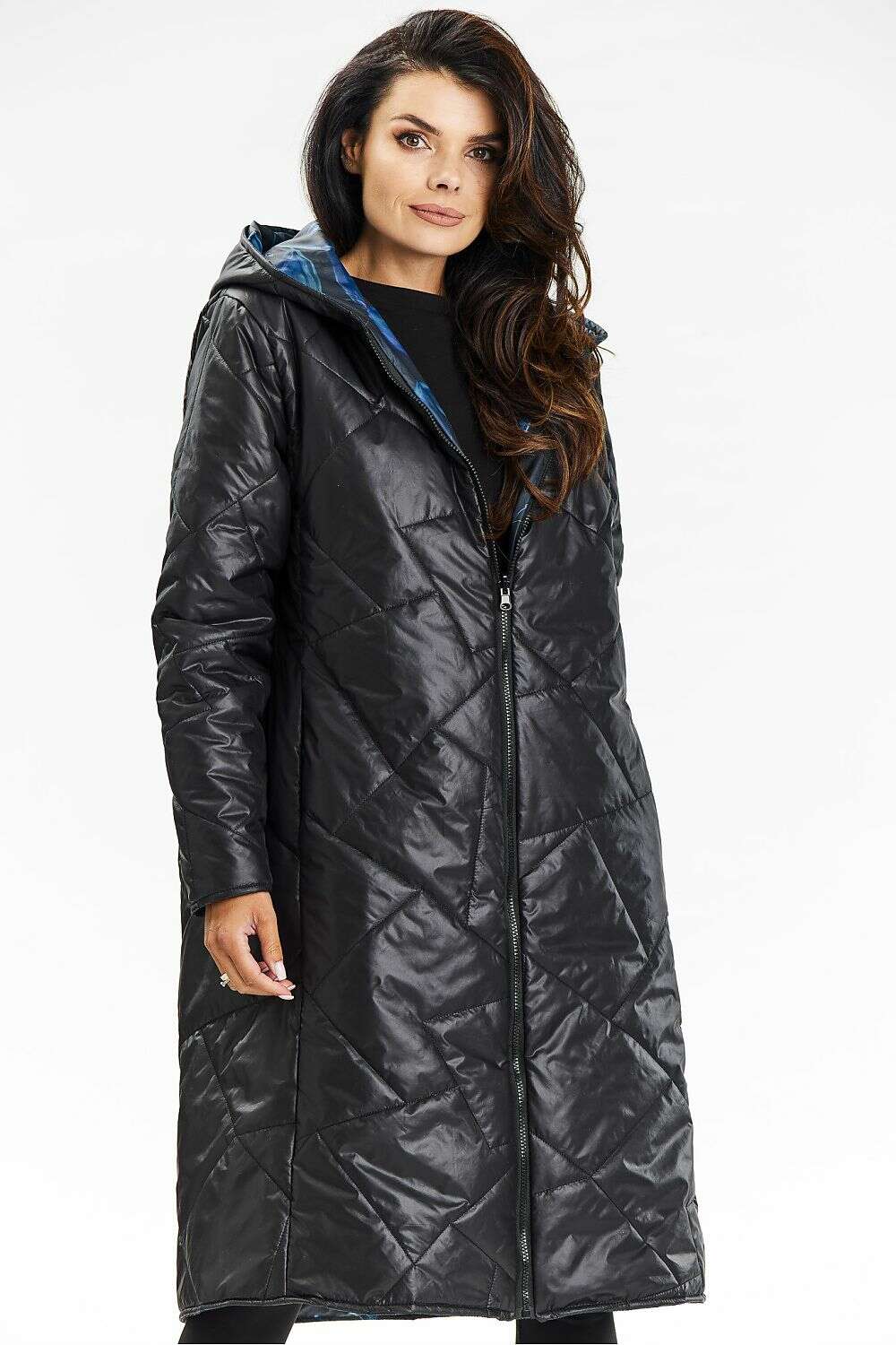 Double-sided hooded coat with zipper. This double-sided hooded coat is the perfect combination of elegance and functionality. Thanks to the double-sided design, you can match it to your mood, one side is a classic, minimalist style, while the other is a starry sky. The quilted material provides warmth and comfort, while the zipper makes it easy to use, and the slip pockets will accommodate the necessary small items.