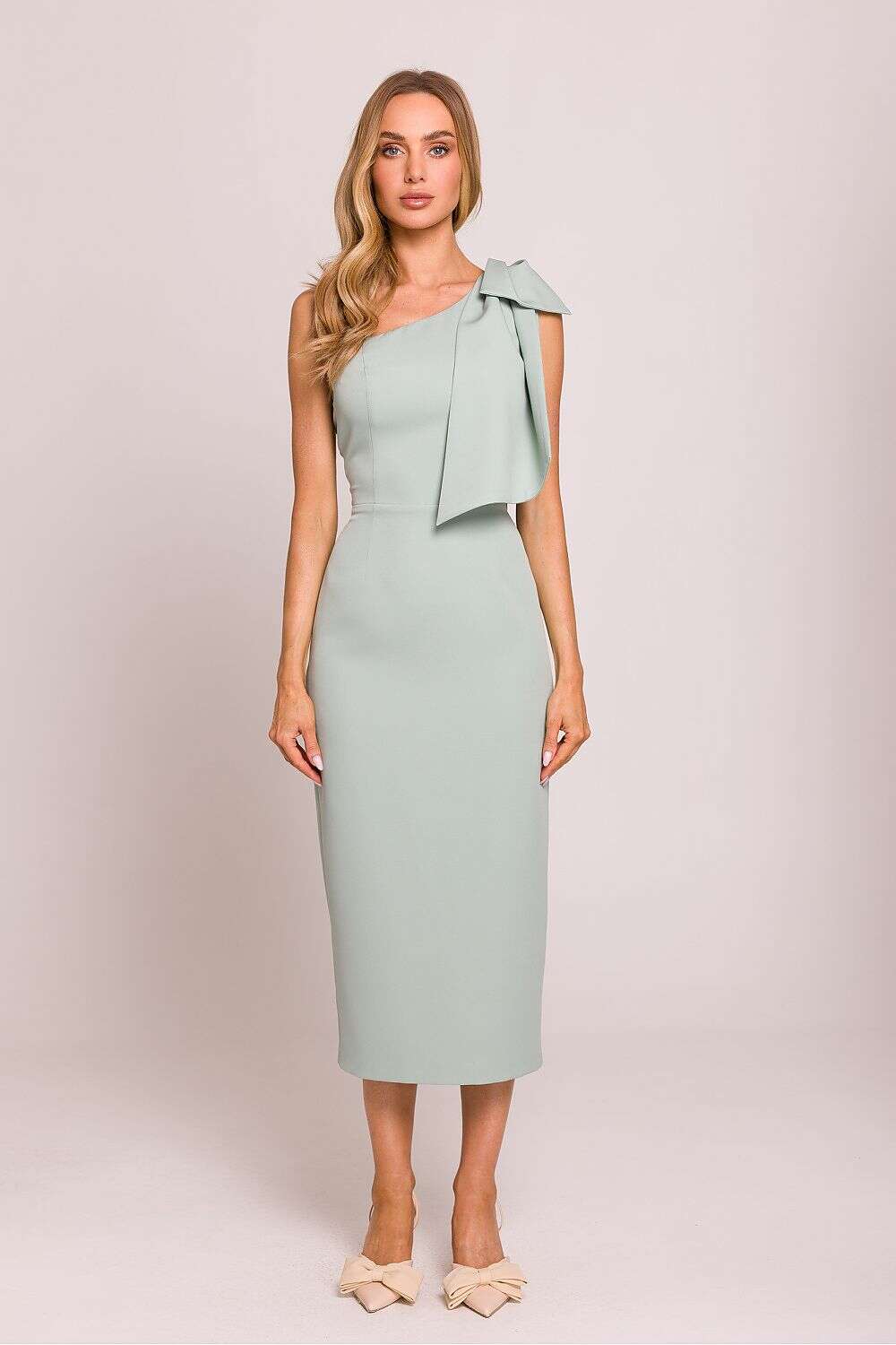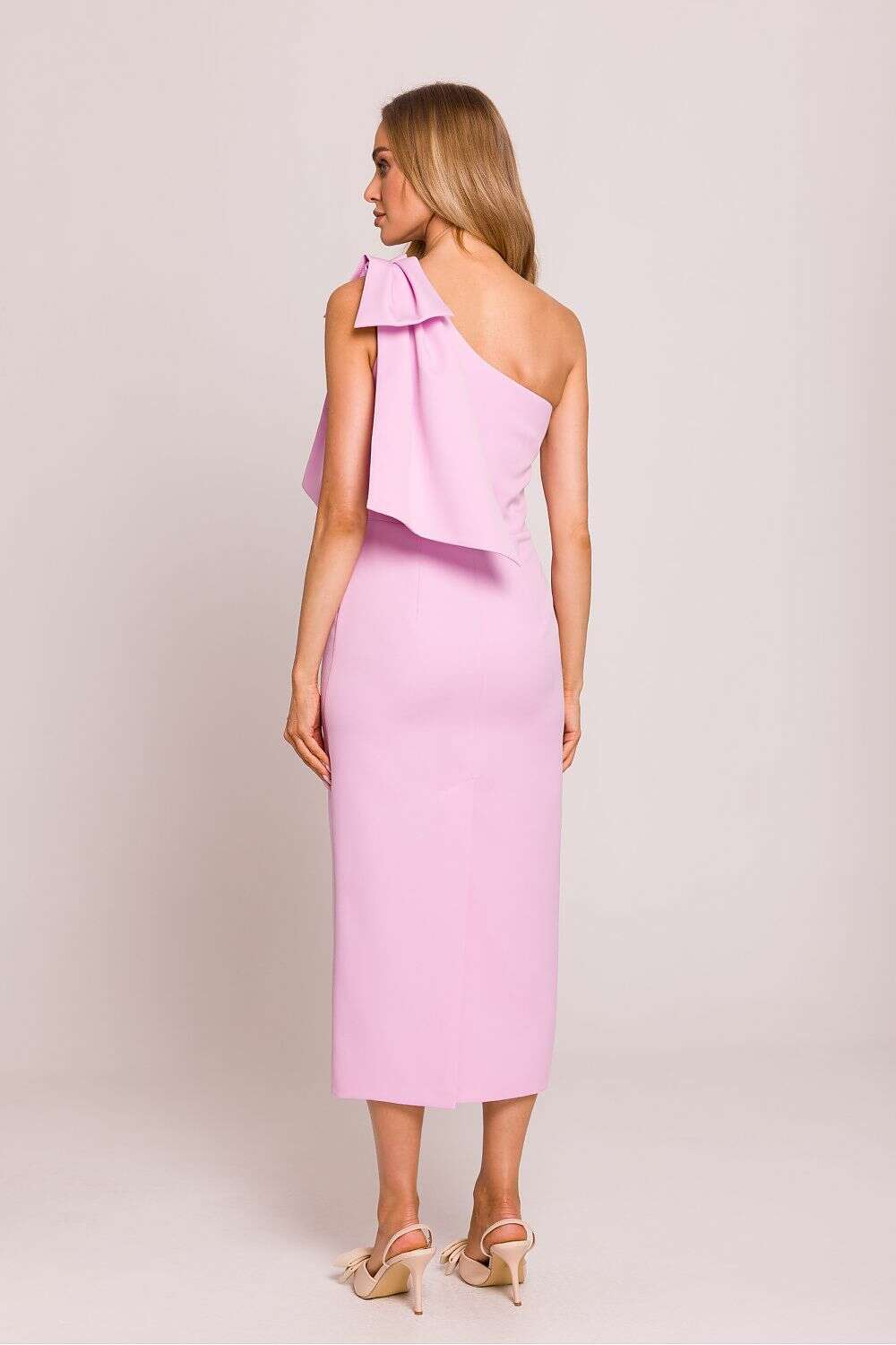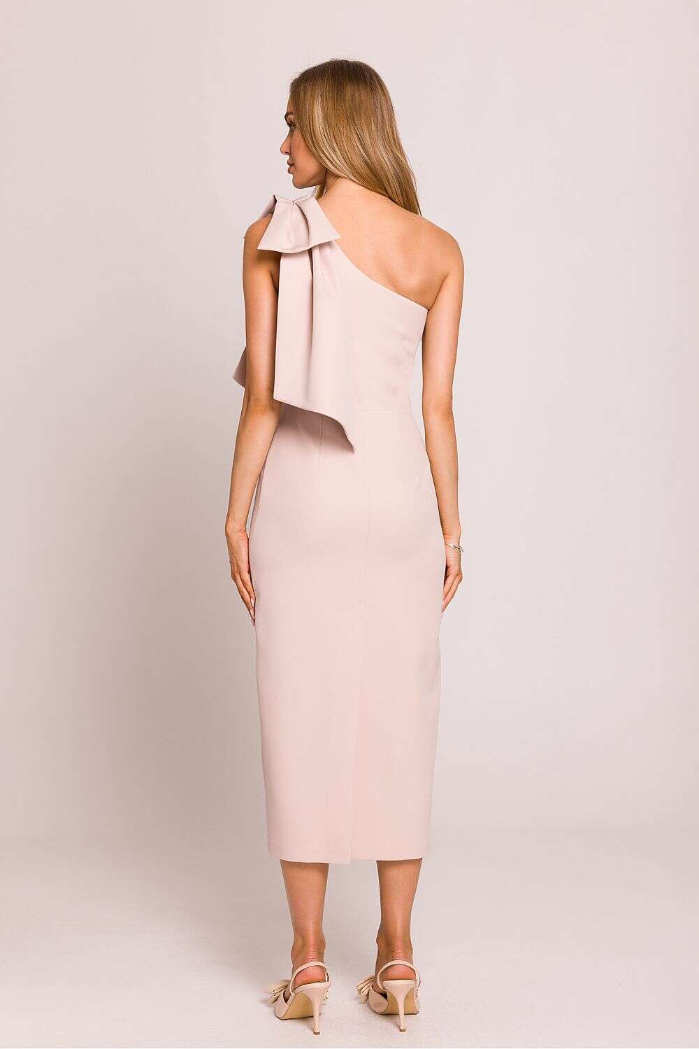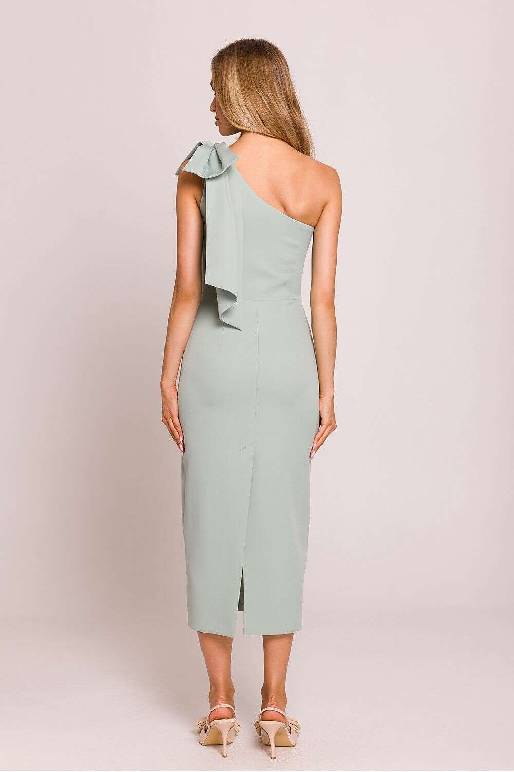 Elegant midi dress with a pencil silhouette, emphasizing the feminine figure. The model amazes with an asymmetrical cut with a motif on one shoulder, decorated with a fancy bow that adds elegance and a unique character. A high slit at the back subtly exposes the leg, giving the outfit lightness and sensuality. The dress is fastened on the side with a concealed zipper, ensuring a perfect fit. Partial lining guarantees comfort when wearing. Designed and sewn in Poland with attention to every detail.