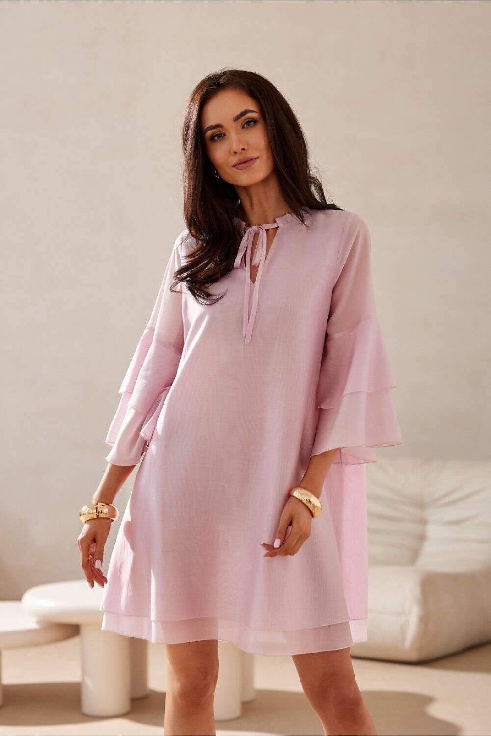 Beatrice dress with a trapeze cut and knee-length, made of lightweight and breathable Lyocell. The model features a V-neck with a low stand-up collar and lacing with cords. 3/4 sleeves finished with a double flounce give the whole lightness. The dress can be worn loosely or tied at the waist with a wide belt made of the same material, allowing for adjustment to any silhouette.
