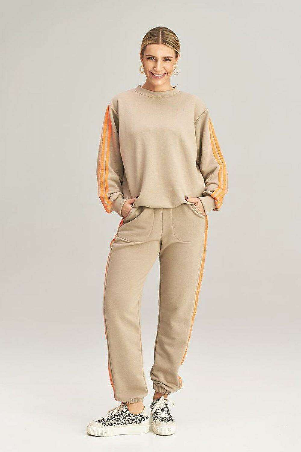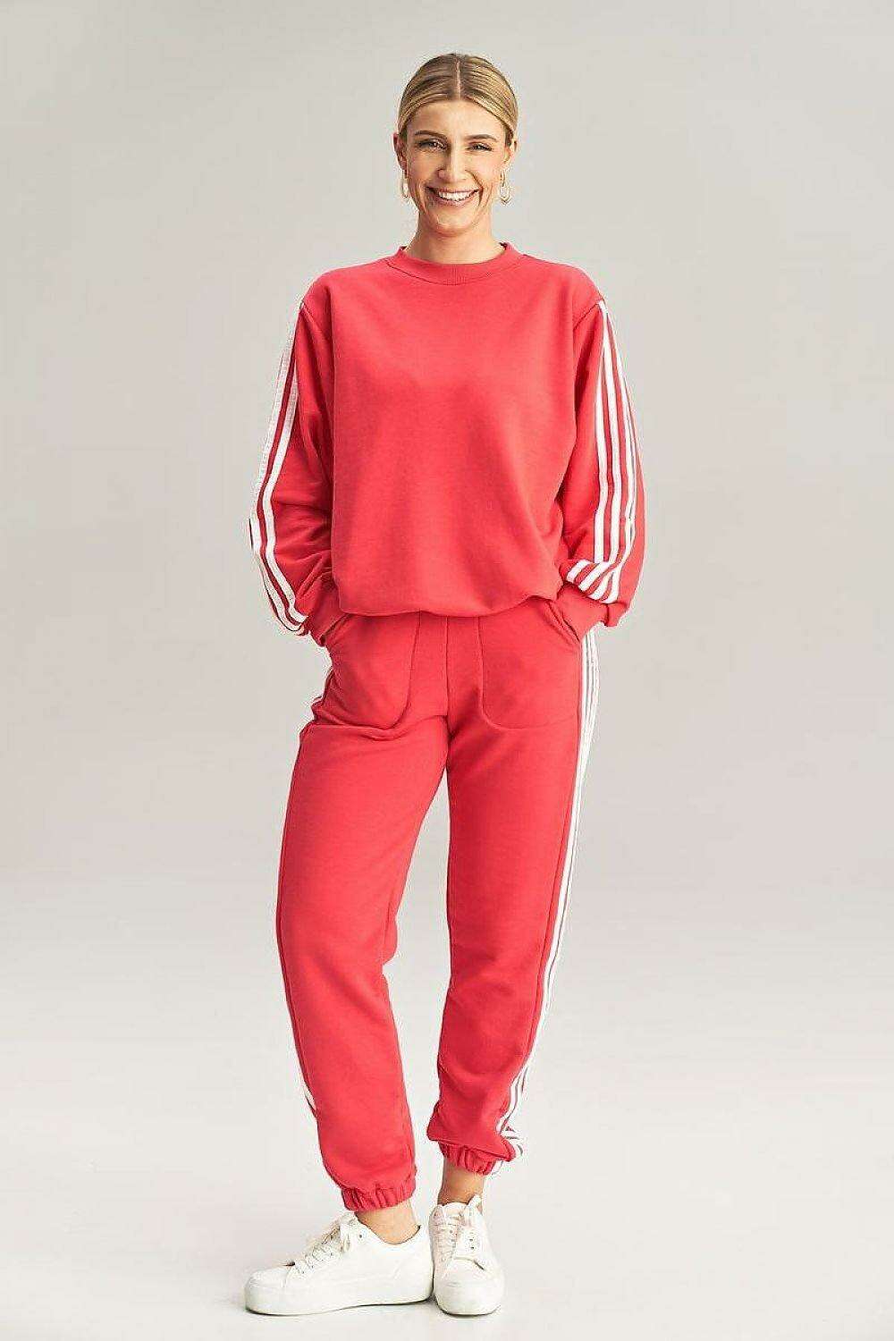 • Cozy Sweatpants: Designed with an elastic waistband and convenient slip pockets, these sweatpants feature matching stripes along the pant legs for a cohesive look.