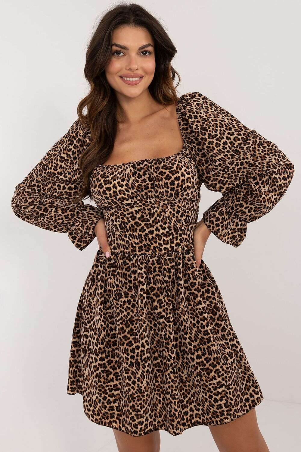 Daydress model 200489 is an everyday flared dress designed for comfort and style. Its long sleeves and mini length make it versatile for daily wear and parties, while the distinctive animal pattern adds a fashionable touch to any look.