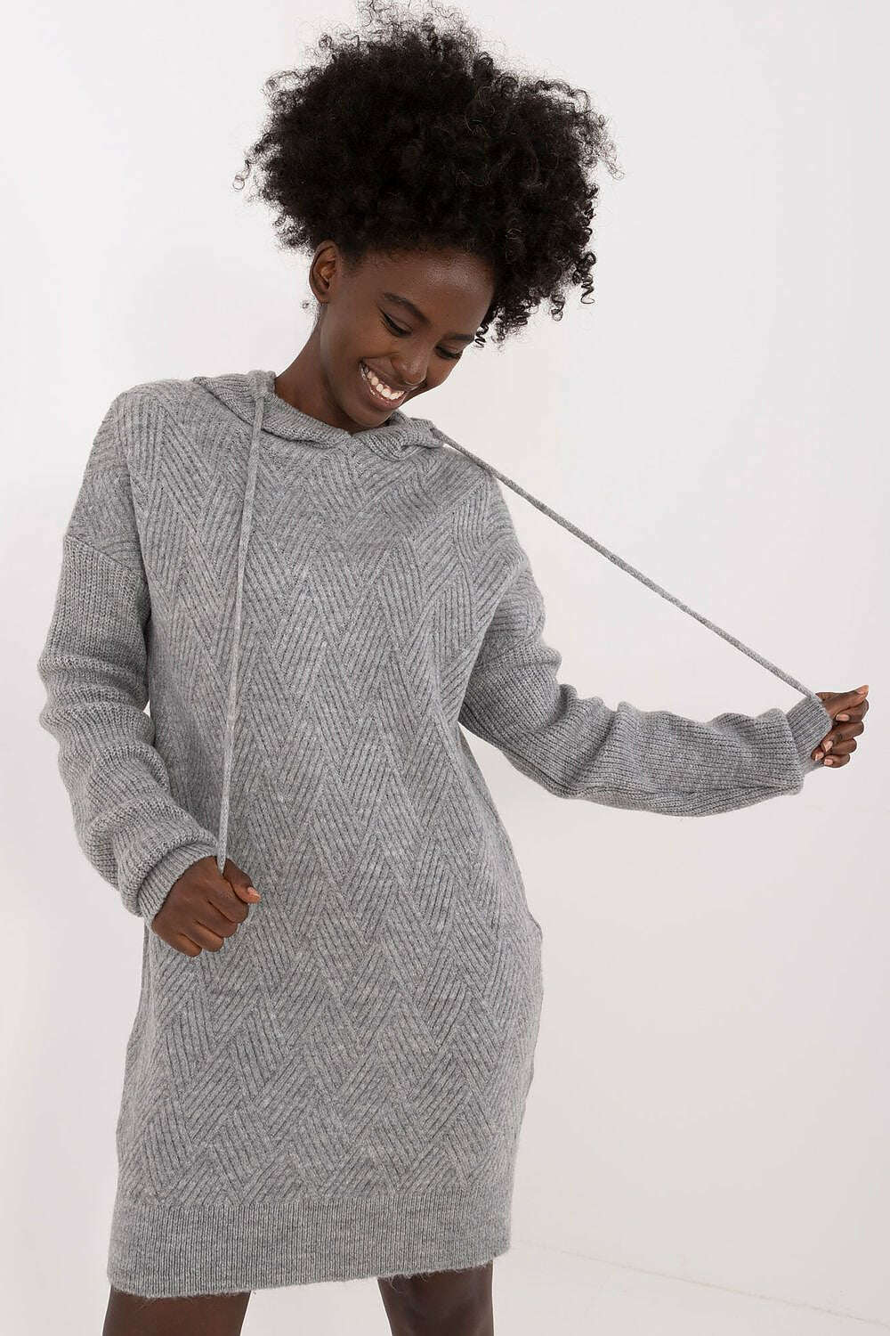 Knitted dress with a hood in a casual style, perfect for everyday occasions. Its short mini length and long sleeves give it a fashionable yet comfortable character. Made of acrylic with additives, it provides comfort and warmth. The hood adds a sporty accent, making the dress perfect for casual stylings.