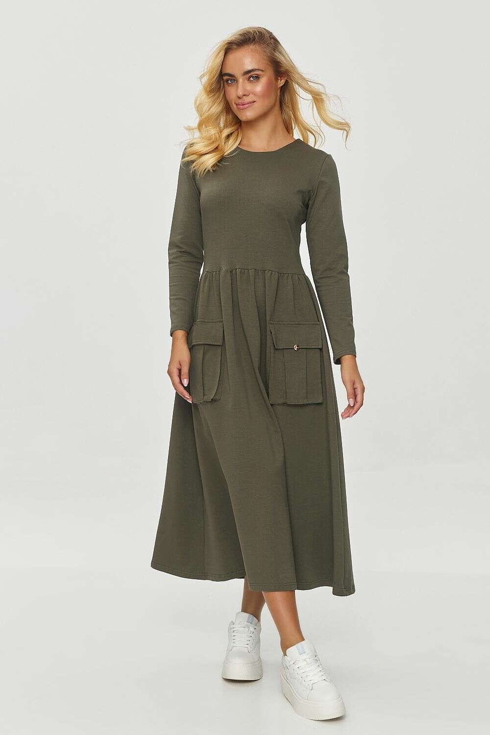 A flared dress is a perfect choice for people who value the combination of style and functionality. The model has a classic, feminine cut with a midi length and a flared bottom. Made of soft, comfortable material that works great for everyday use. The dress has long sleeves, making it ideal for cooler days. The waist cut gives the effect of subtle wrinkling, which emphasizes the silhouette and adds charm to the dress. The characteristic element is large, sewn-on pockets at the front, additionally decorated with an elegant gilded detail, which not only adds style but also serves a practical function. This model combines comfort and fashionable design, making it an ideal choice for different occasions.