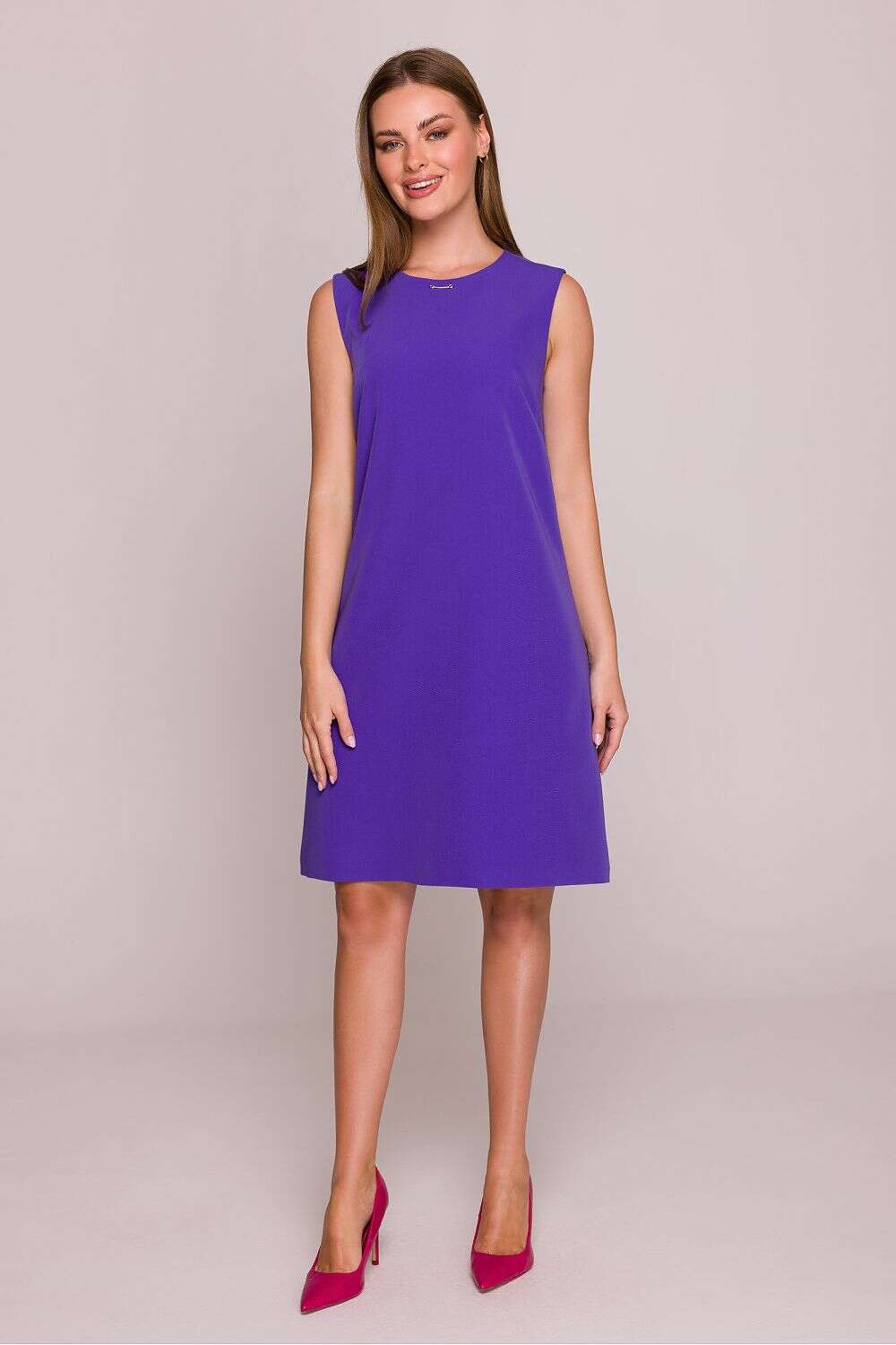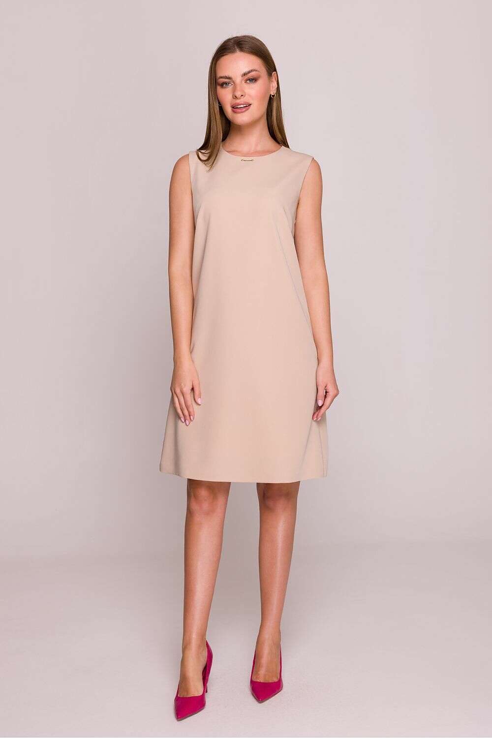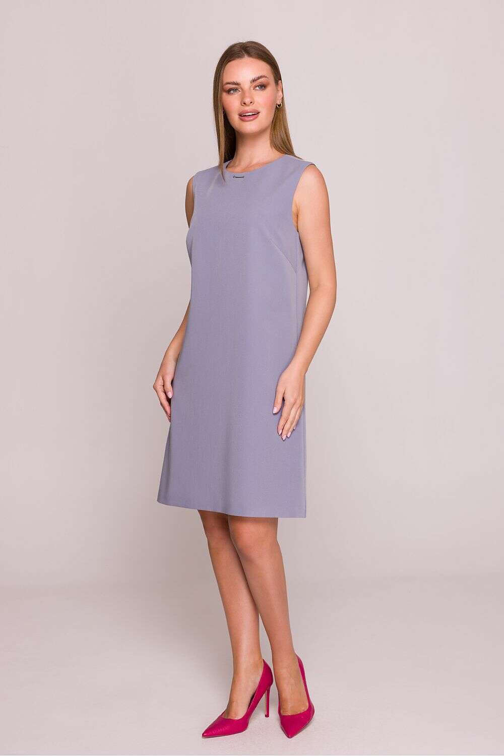 Elegant dress made of smooth, slightly stretchy fabric with a satin finish, which gently shines and gives the whole a unique character. The model with a round neckline under the neck decorated with a metal detail, which adds subtle elegance. Sleeveless dress, fastened with a hidden zipper at the back, which ensures comfort and a minimalist look. The cut is simple, trapezoidal, loose and not tight-fitting, perfect for everyday wear and the office. The dress has a lining that increases comfort and durability of the clothing. The length above the knee emphasizes the feminine silhouette, while providing freedom of movement. Designed and sewn in Poland.