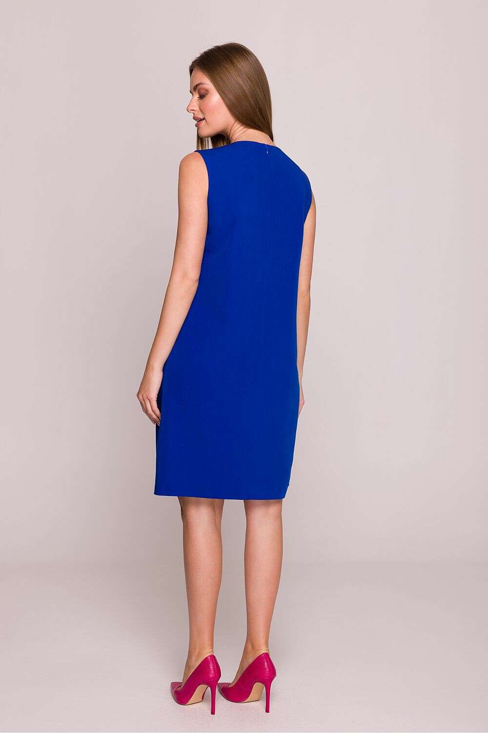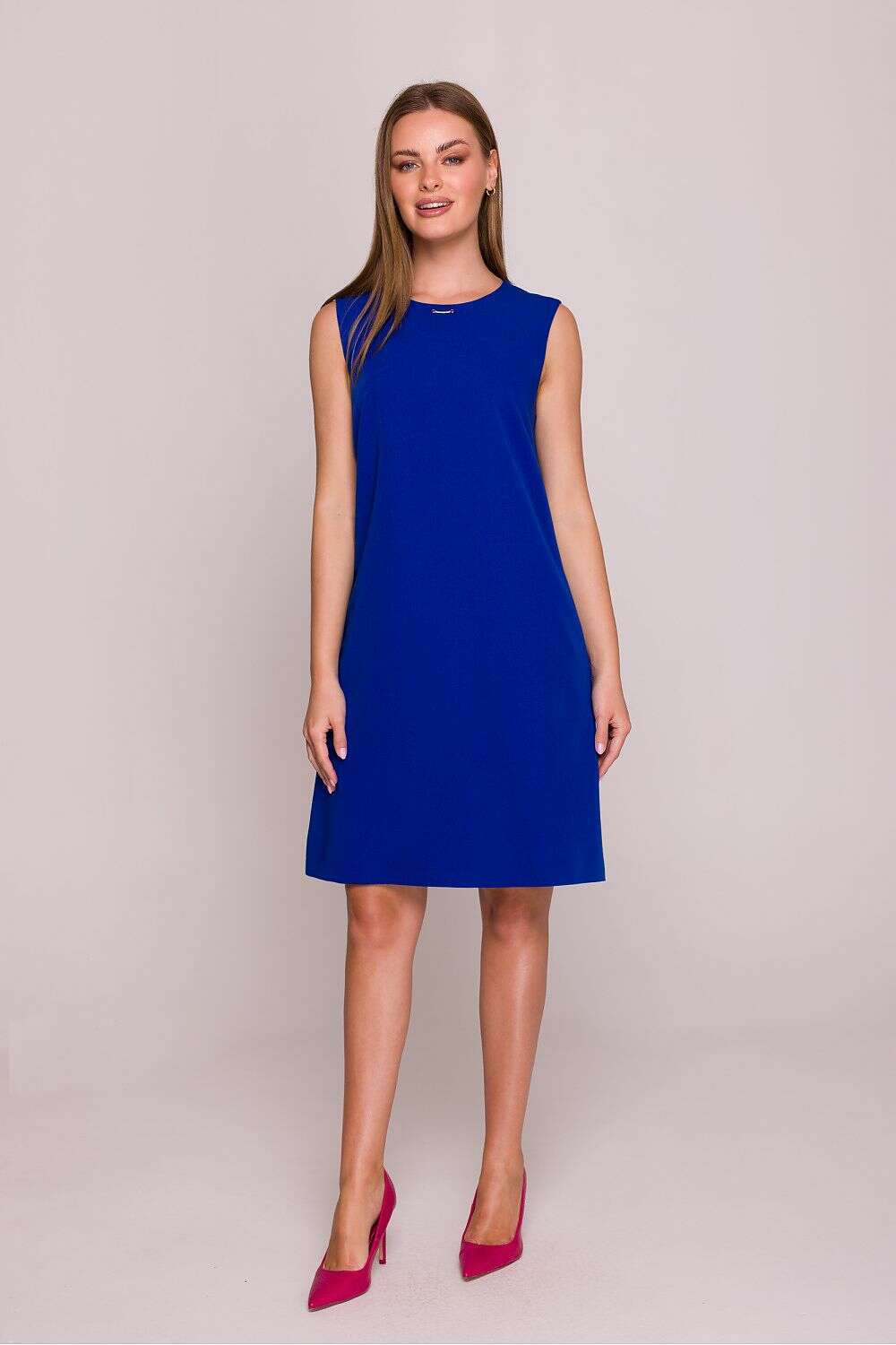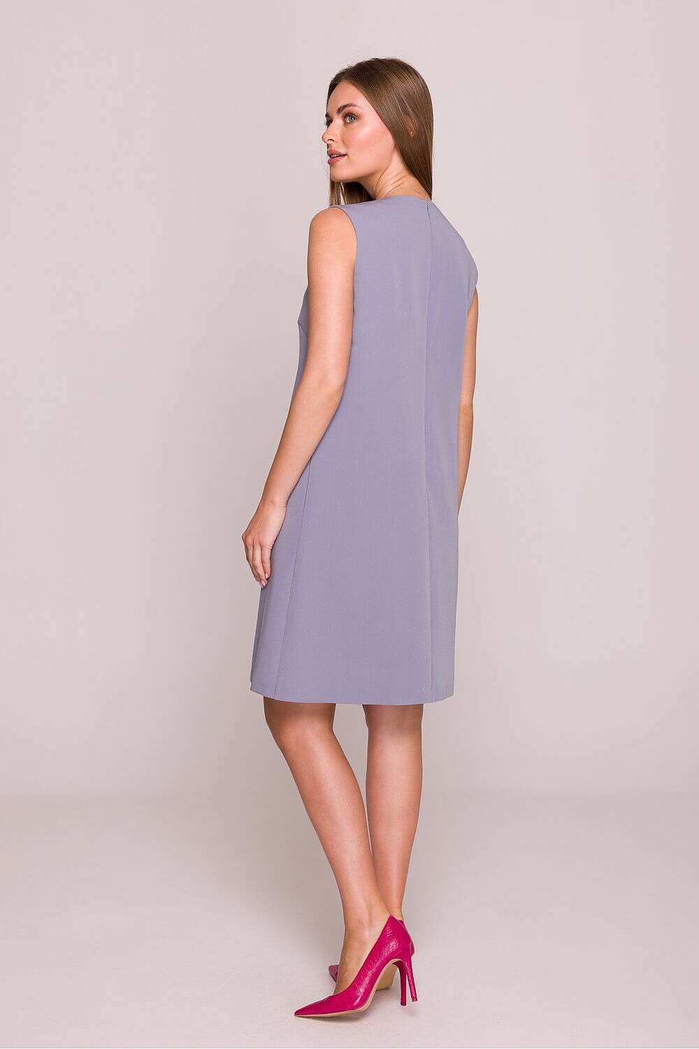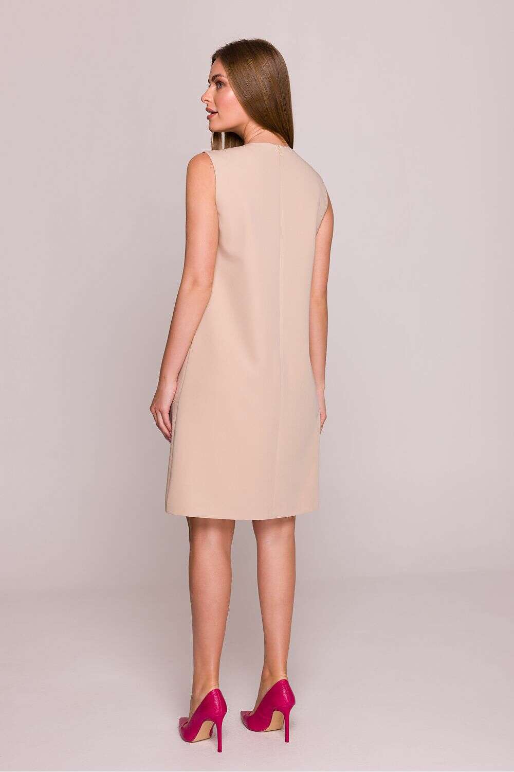 Elegant dress made of smooth, slightly stretchy fabric with a satin finish, which gently shines and gives the whole a unique character. The model with a round neckline under the neck decorated with a metal detail, which adds subtle elegance. Sleeveless dress, fastened with a hidden zipper at the back, which ensures comfort and a minimalist look. The cut is simple, trapezoidal, loose and not tight-fitting, perfect for everyday wear and the office. The dress has a lining that increases comfort and durability of the clothing. The length above the knee emphasizes the feminine silhouette, while providing freedom of movement. Designed and sewn in Poland.