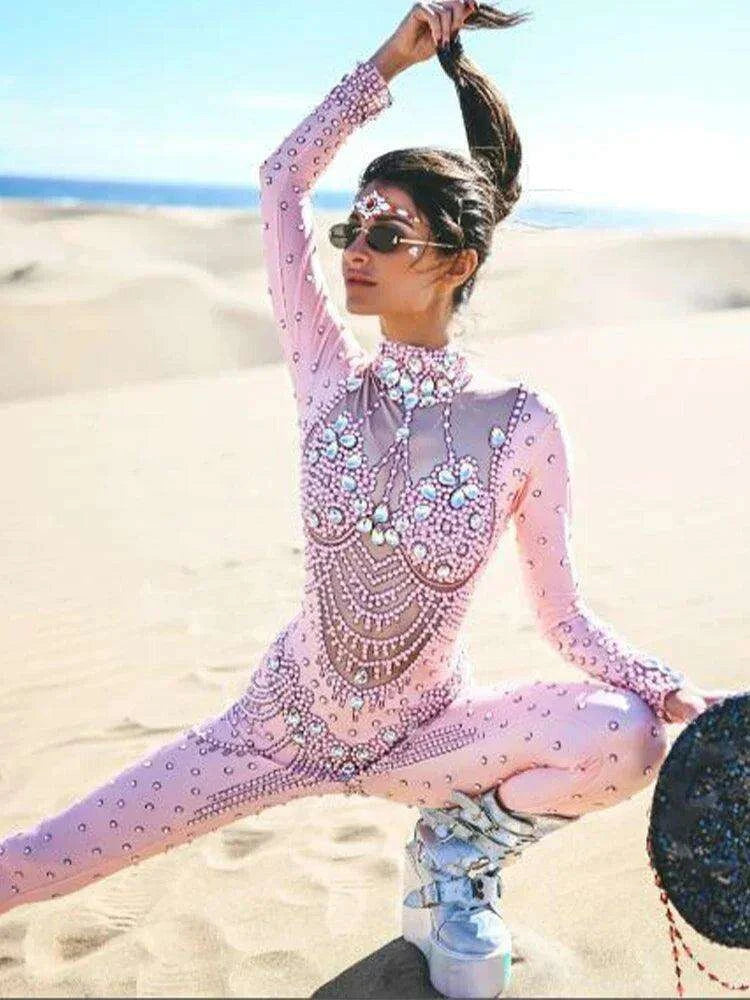 Glamorous Pink Crystal-Studded Bodysuit for Female Performers - Perfect for Stage Shows & Celebratory Events
