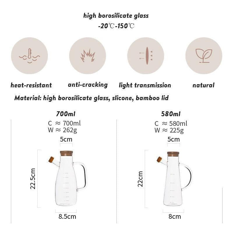 With the Elegant Glass Oil Dispenser, elevate your cooking experience like never before. Its thoughtful design guarantees not only ease of use but also a chic presence in your kitchen. The handle allows for comfortable handling and the bamboo lid complements the glass body, creating a harmonious look.