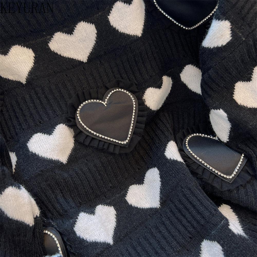 Elegant Heart Jacquard Knit Sweater - Luxury Edition with Ruffled Accents and Sparkling Details