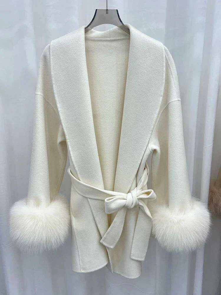 Chic Korean Wool Coat with Authentic Fox Fur Cuffs and Stylish Waist Belt - Elevate Your Autumn Look