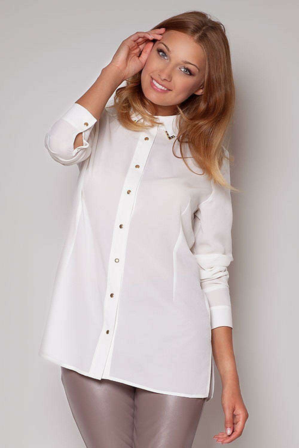 Elevate your wardrobe with the Sophisticated Golden Button Long Sleeve Blouse by Figl, the essential shirt of the season. This exquisite long sleeve blouse is designed to enhance your style with its elegant collar and striking golden button detail, ensuring you turn heads in any environment.