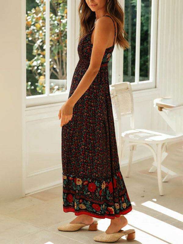 Bohemian Blossom V-Neck Swing Dress with Suspender Straps