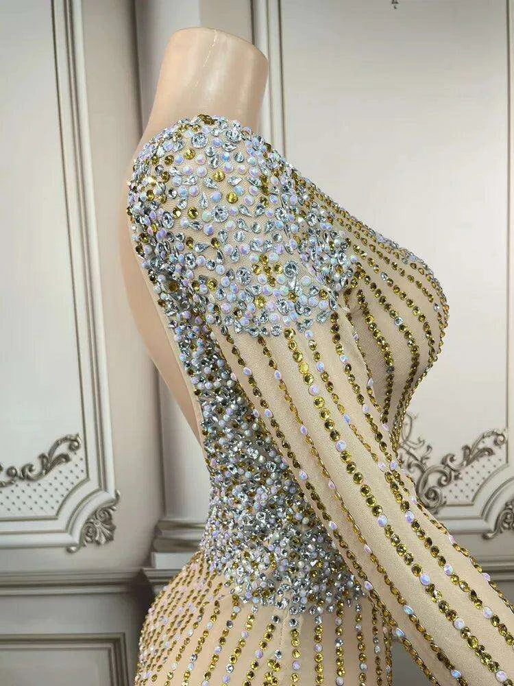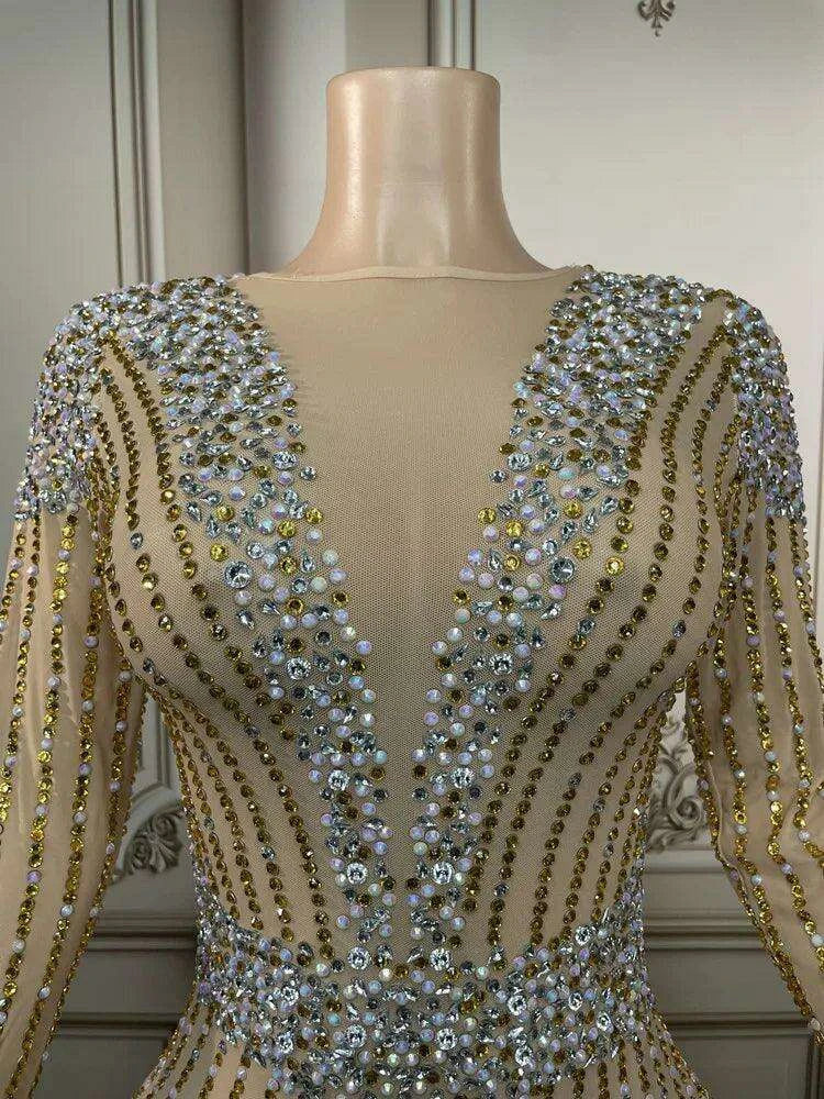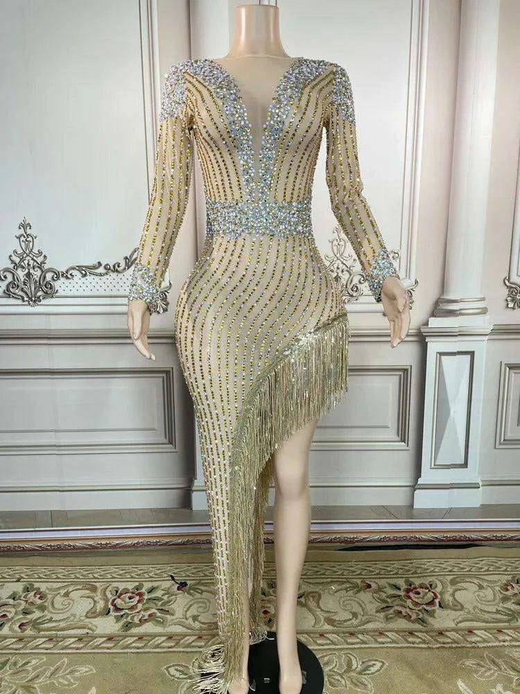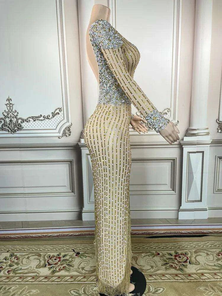 Step into the spotlight with the Glamorous Golden Diamond Tassel Evening Gown, a stunning piece designed for unforgettable nights in the luxurious settings of Dubai and Saudi Arabia.