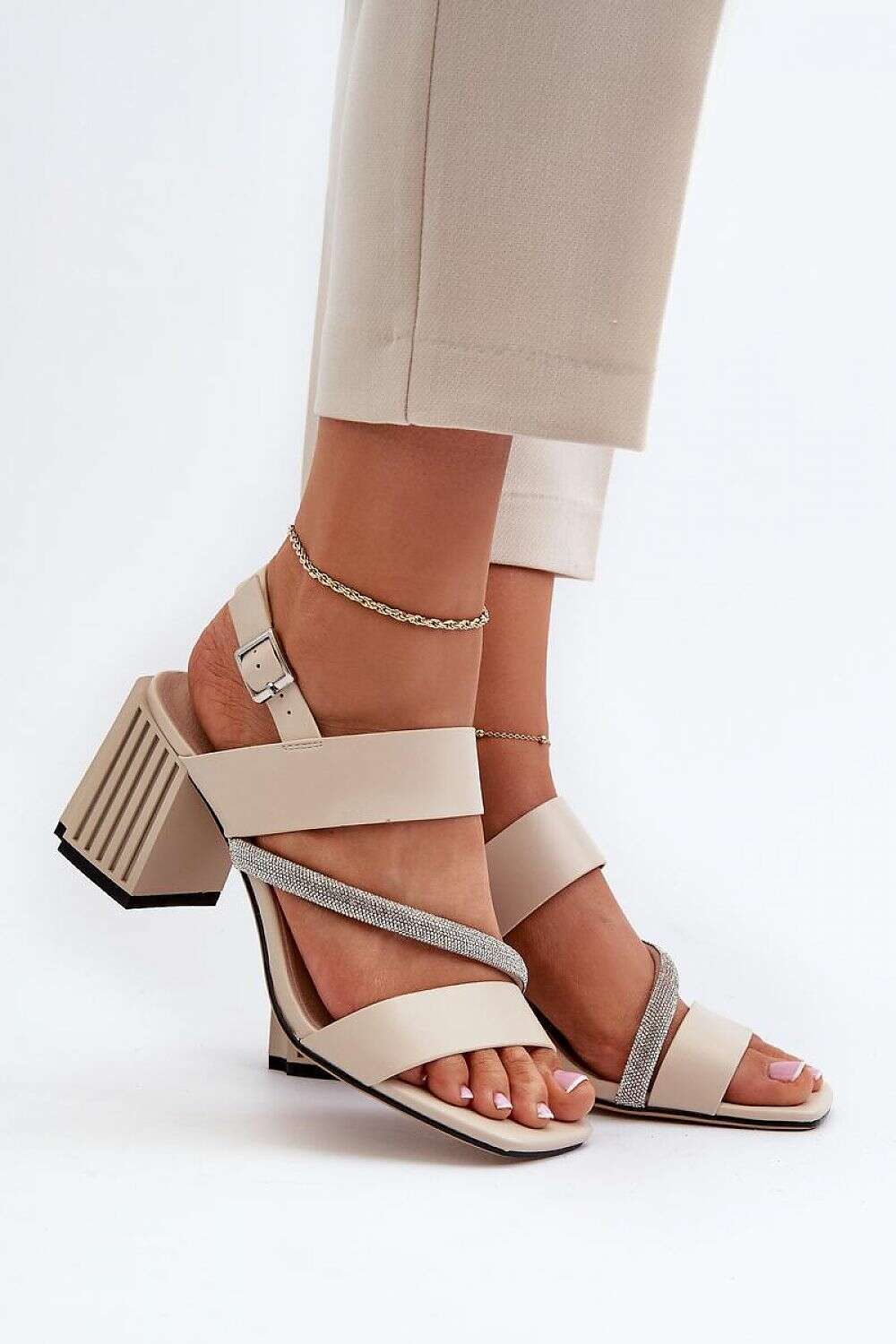 Elegant women's sandals made of eco leather. Set on a heel in the form of a post. Additional charm is added by an ornamental strap decorated with numerous small cubic zirconias, which attract attention and give the shoes a unique shine. This is the perfect footwear for special occasions and evening outings, which will emphasize your individual style.