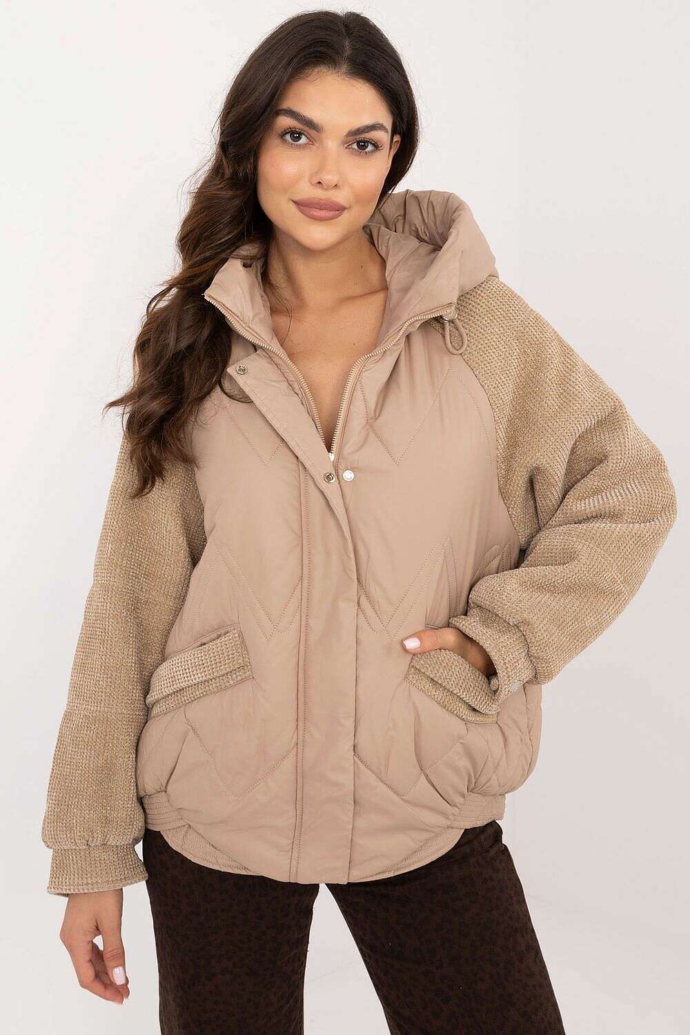 Women's casual jacket with striking corduroy sleeves, ideal for everyday outings in the autumn-winter season. Made of polyester, it combines durability and a fashionable look. The smooth pattern and standard length make the jacket a great fit for urban, everyday styling. The jacket is uninsulated, making it ideal as a lighter option for cooler days. Equipped with a hood, it provides additional protection from wind and rain. The zipper and snap fastening guarantees comfort and functionality. In addition, the jacket has decorative quilting, which adds to its originality, and zippered slip pockets, practical for storing small items. The interior of the jacket is finished with a lining for additional comfort.