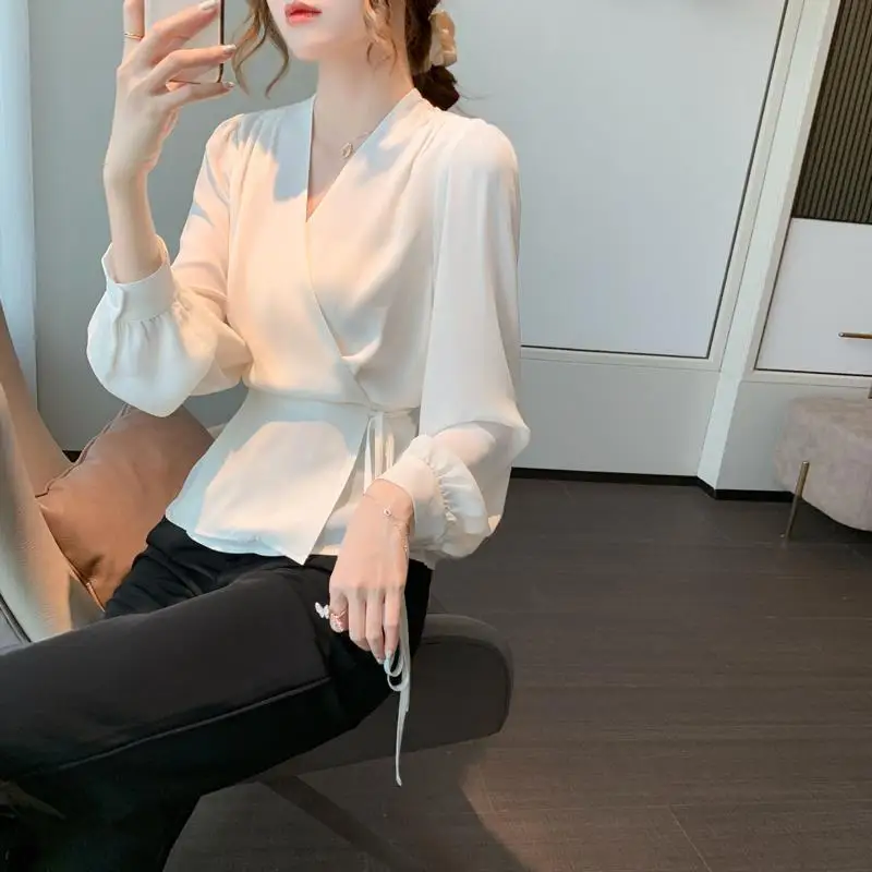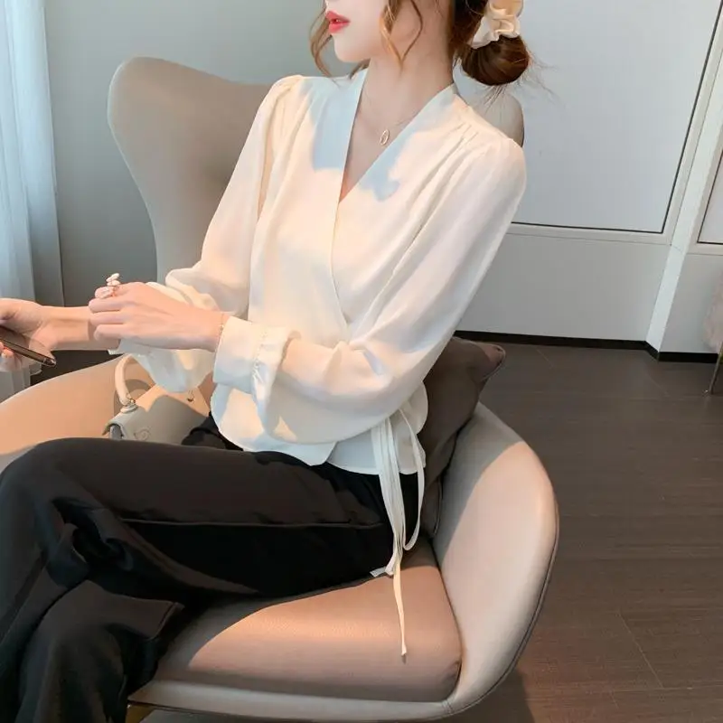 Elevate your wardrobe with the perfect fusion of style and comfort: the Korean-Style Women's V-Neck Lace-Up Blouse. This stunning piece is designed to be your go-to top for the transitional seasons of spring and autumn, effortlessly enhancing your everyday look.