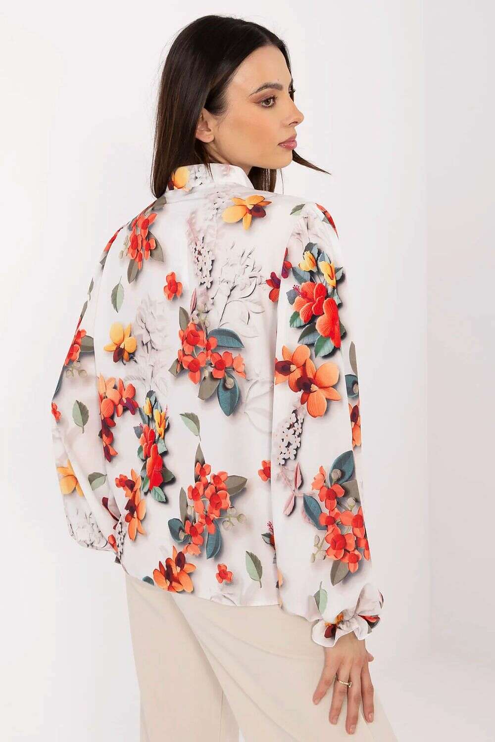 Unique women's shirt with an elegant character, perfect for work and formal occasions. Made of high-quality blend of cotton, polyester, and elastane, it combines comfort and impeccable appearance. The delicate, floral pattern gives it a feminine charm, and well-thought-out details, such as puffy sleeves finished with a subtle ruffle and a classic collar, emphasize its stylish form. Standard length and button closure make the shirt look great both paired with elegant trousers and a skirt. A timeless proposal for women who appreciate chic with a touch of romance.