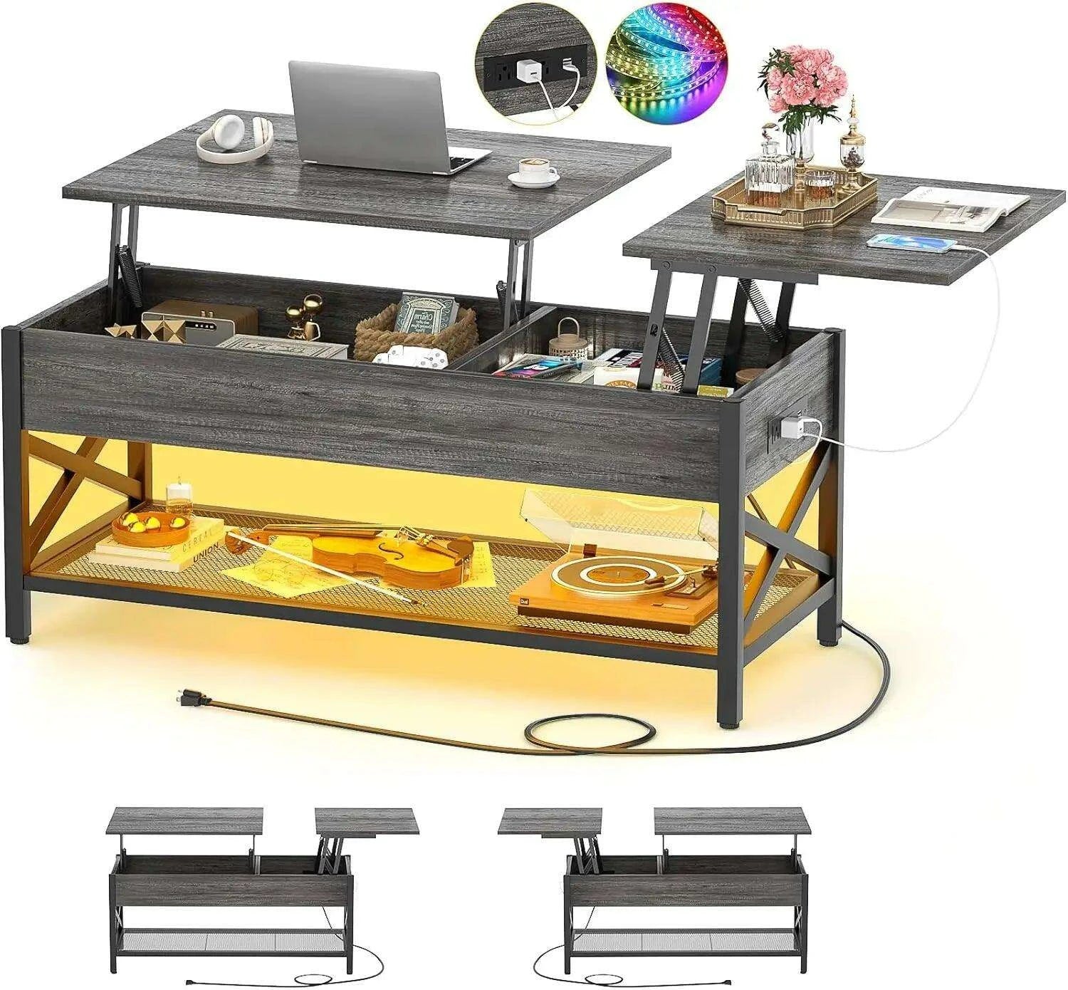 Versatile Lift-Top Coffee Table with Integrated LED Lighting, Power Outlets, and Ample Storage