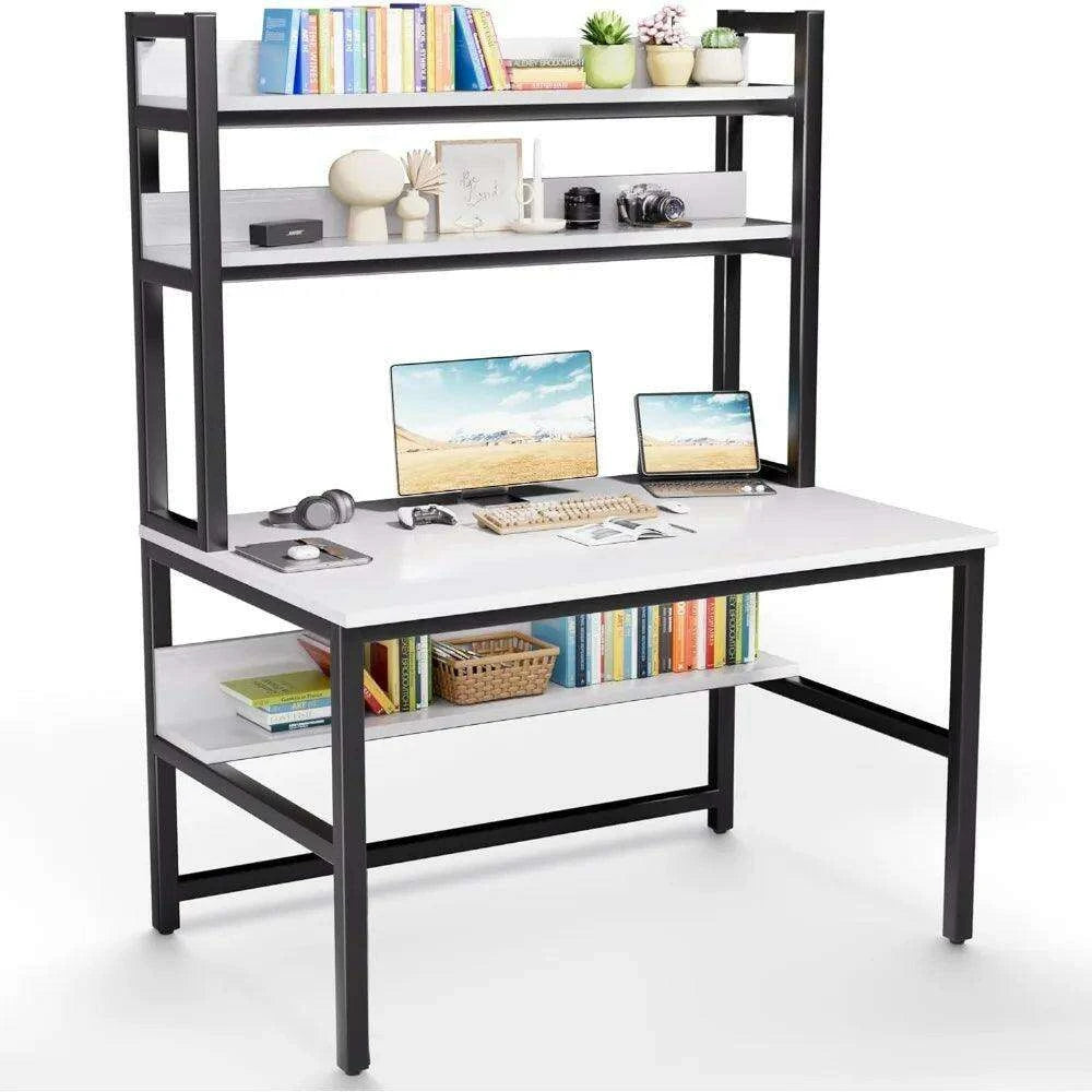 Modern White Office Desk with Hutch and 3-Tier Bookshelf for Stylish Workspace Efficiency..