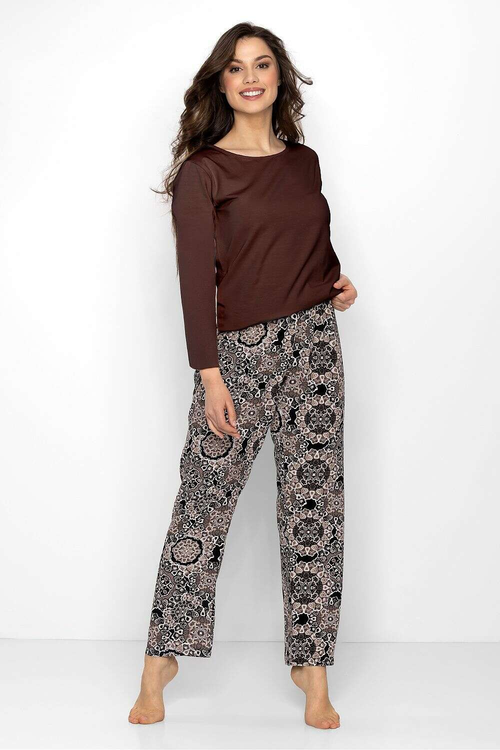 Women's pajamas that combine elegance with comfort. A long-sleeved blouse with a semi-circular neckline and subtle, feminine styling will work great not only as sleepwear, but also as stylish homewear. Made of soft, breathable fabric with a quilted texture, it ensures comfort throughout the day. Pants with long legs and a loose, comfortable cut are the perfect complement to the set. Thanks to the elastic waistband, they adapt to the silhouette, offering freedom of movement. The pajamas stand out with subdued colors and high-quality materials, giving them an elegant look. This is an excellent choice for women who value comfort and style in the comfort of their own home. Composition: Top: 92% cotton, 8% elastane Bottom: 100% viscose