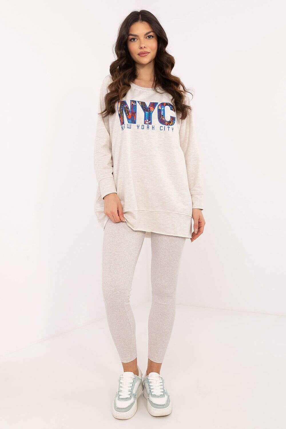 Women's set consisting of a sweatshirt and leggings is the perfect combination of comfort and style. The sweatshirt has a print on the front, which gives it a unique character and emphasizes the modern design. Made from a blend of high-quality cotton, polyester and elastane, it provides comfort and durability. Leggings are distinguished by a high waist, which perfectly emphasizes the waist and provides comfort during daily activities. The tapered legs fit the figure perfectly, and the ribbed material adds subtle texture and a fashionable look. The set will be perfect for everyday outings, walks or moments of relaxation at home. The combination of universal style and functionality makes it a great choice for any season.