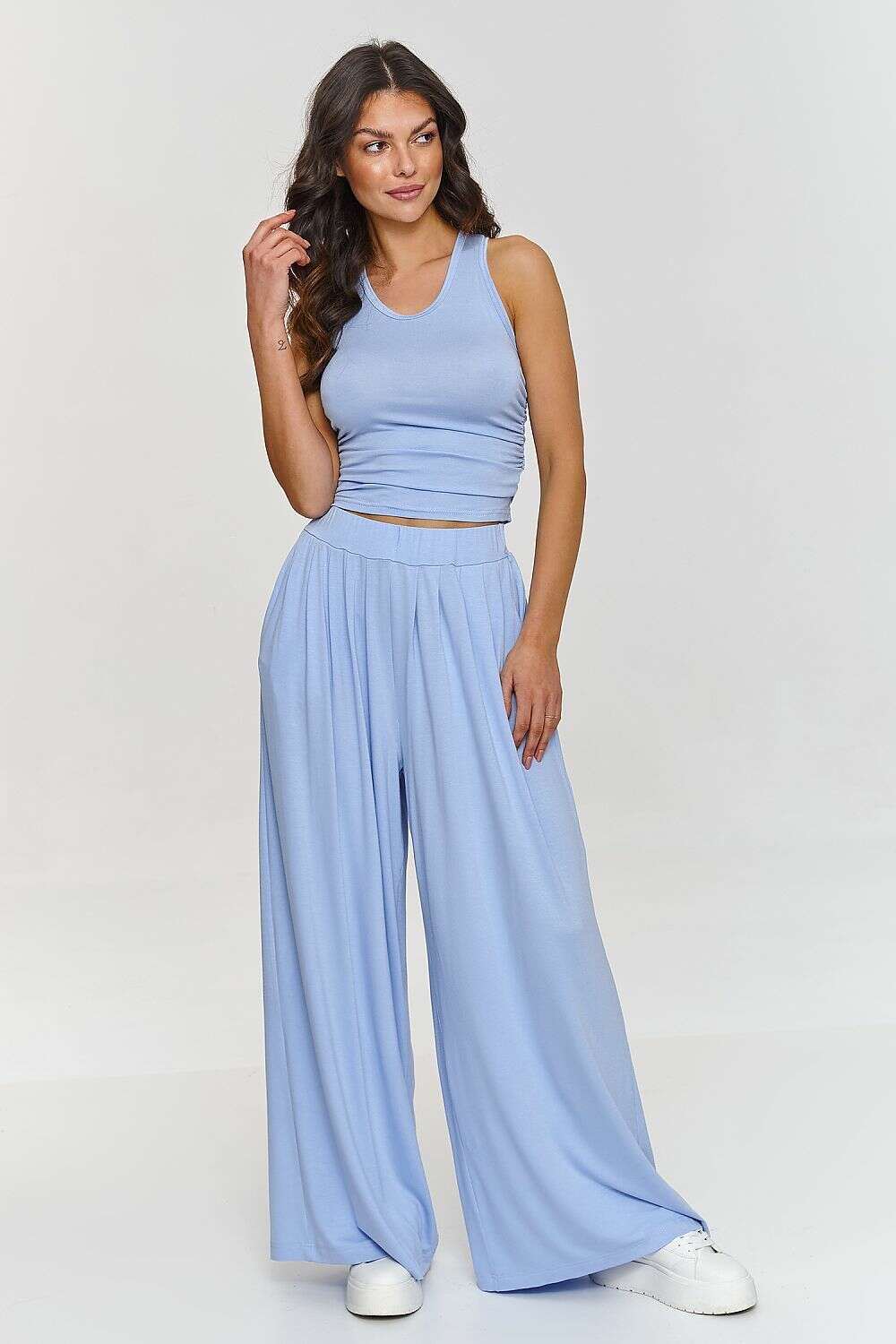 Loose women's set is the perfect proposition for women who are looking for a combination of comfort and elegance. The set includes a fitted top with straps additionally embellished with ruches on the sides and wide high-waisted trousers, which together create a fashionable and comfortable styling. Made of lightweight, breathable viscose, the set is perfect for warm days, providing a feeling of freedom throughout the day. The set is simple but impressive, combining comfort with a modern look. It can be worn both for everyday wear and for less formal meetings. It pairs perfectly with white sneakers or sandals, creating a casual look, but also goes well with more elegant accessories. Undoubtedly, the advantage of this set is the material, which is characterized by excellent breathability, making it comfortable to wear, even for long hours. Our viscose set is a proposal for summer, combining stylish design with comfort. Excellent for work, social meetings, and relaxing days in the garden. Invest in this fashionable set that will provide you with comfort and style throughout the day!