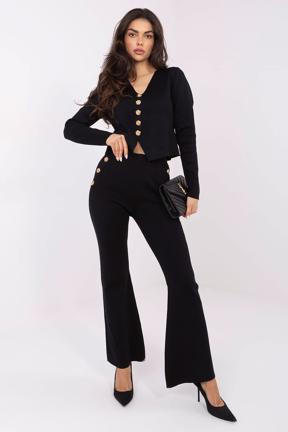 The sweater’s snapped closure and flattering V-neck subtly emphasize a feminine silhouette, while the high-waisted pants with wide legs provide a modern, streamlined look. An integrated elastic band at the waist ensures a perfect fit, and decorative buttons on the pant line add a elegant finishing touch that sets this set apart.