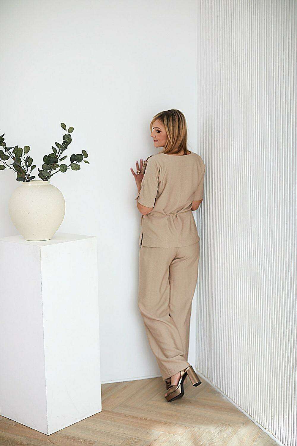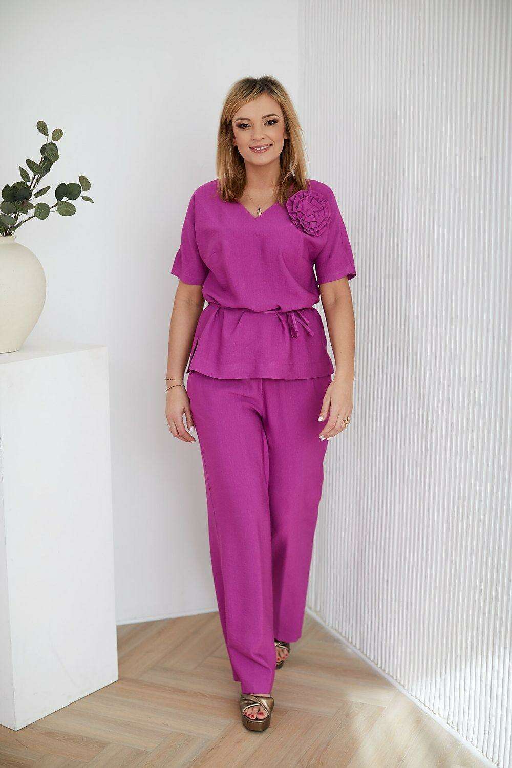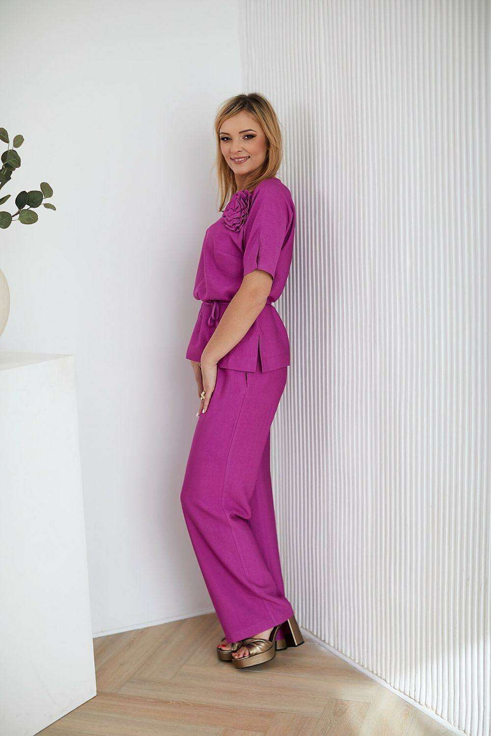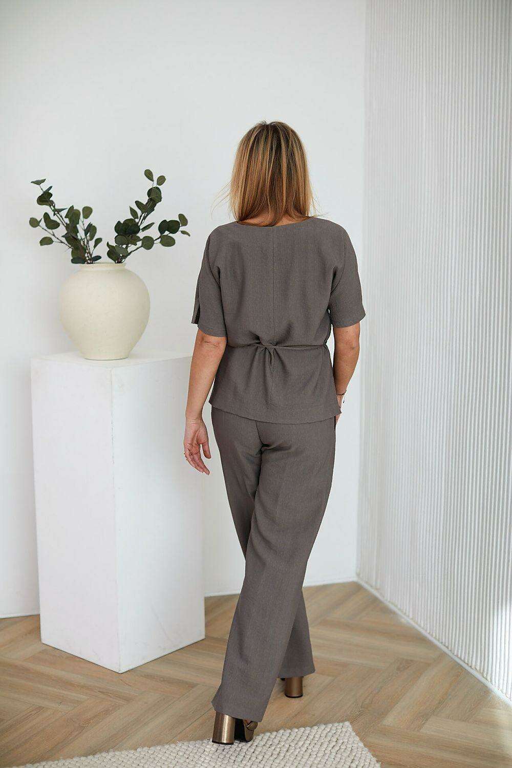 • Chic Details: The blouse showcases decorative slits on the hips and sleeves, infusing a sophisticated flair. The pants feature a slightly wider cut, with an elastic band at the back and a discreet covered zipper on the side for a seamless fit.