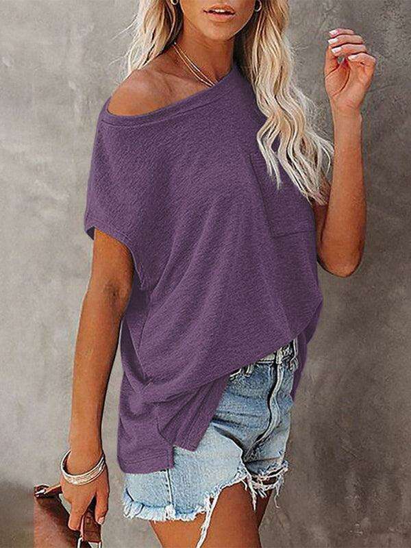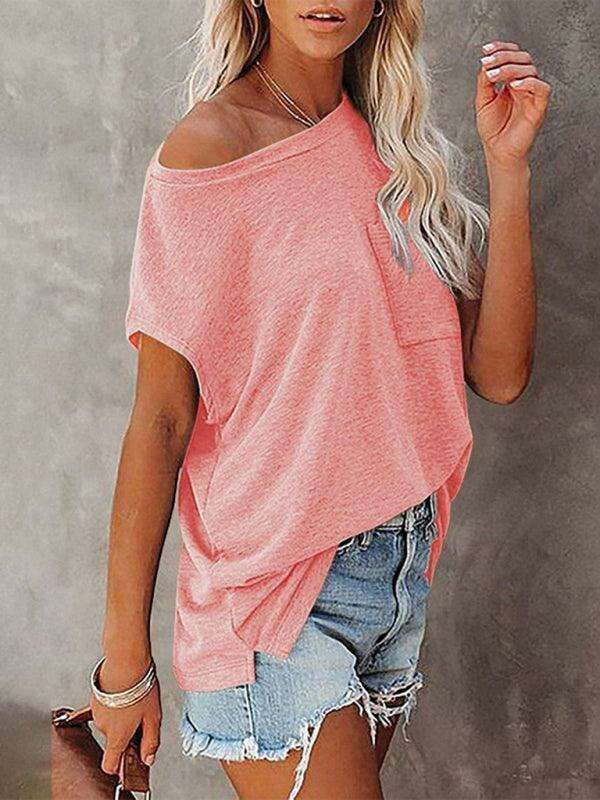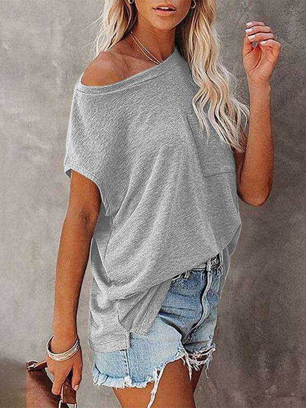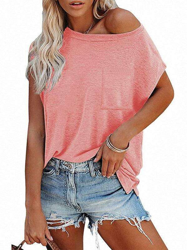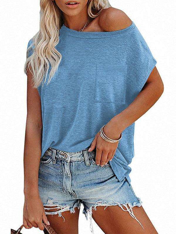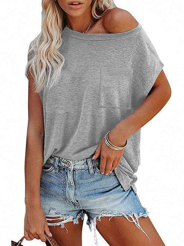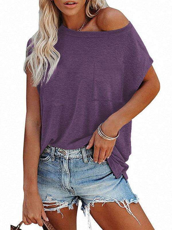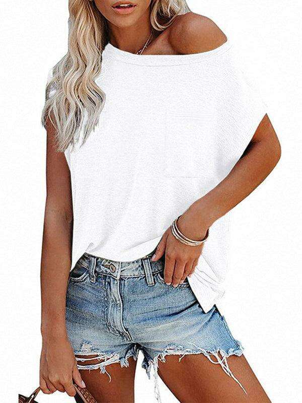 Embrace effortless style and comfort with our Chic Off-Shoulder Pocket Top. This trendy solid color round neck tee is the perfect addition to your wardrobe, effortlessly combining fashion with functionality.