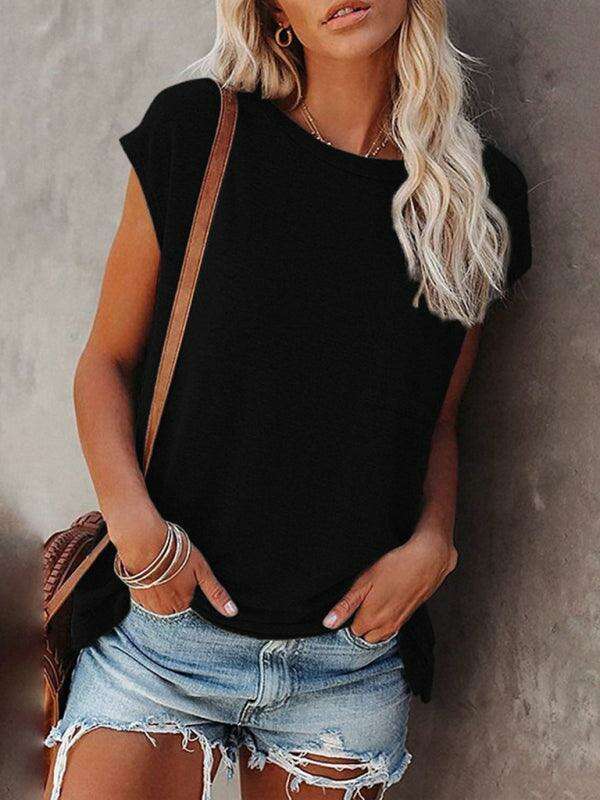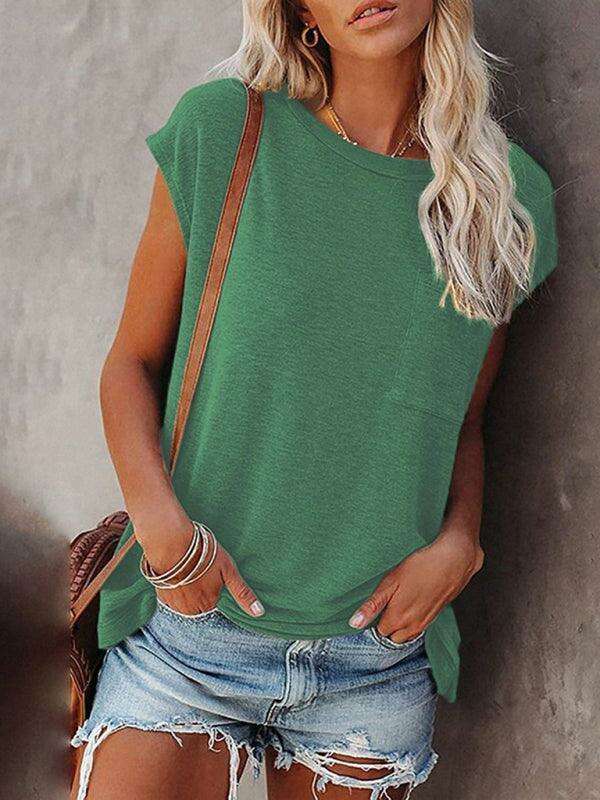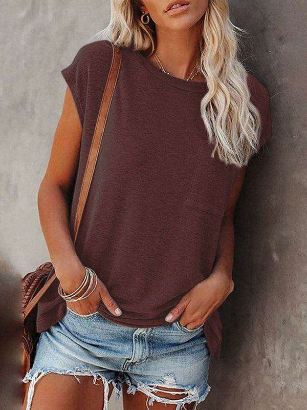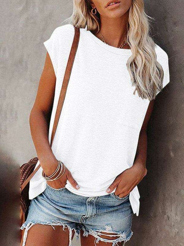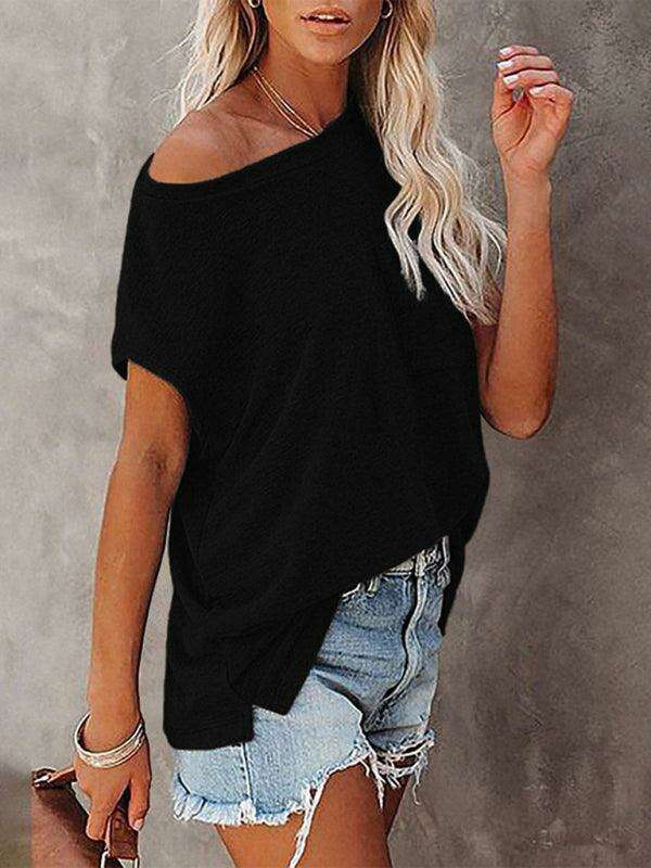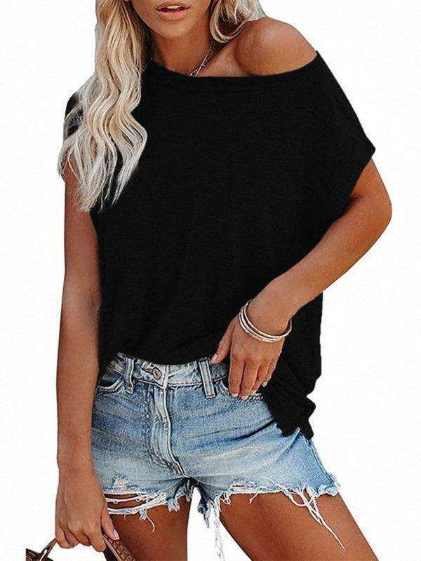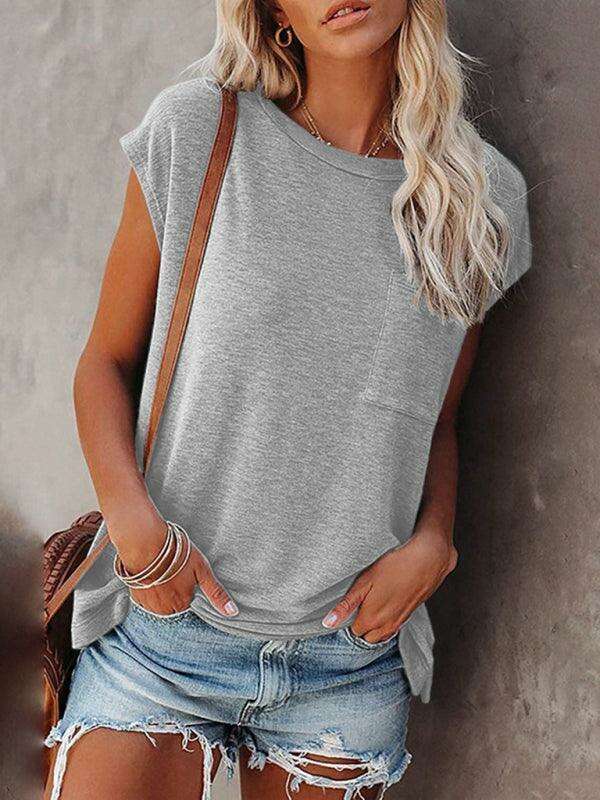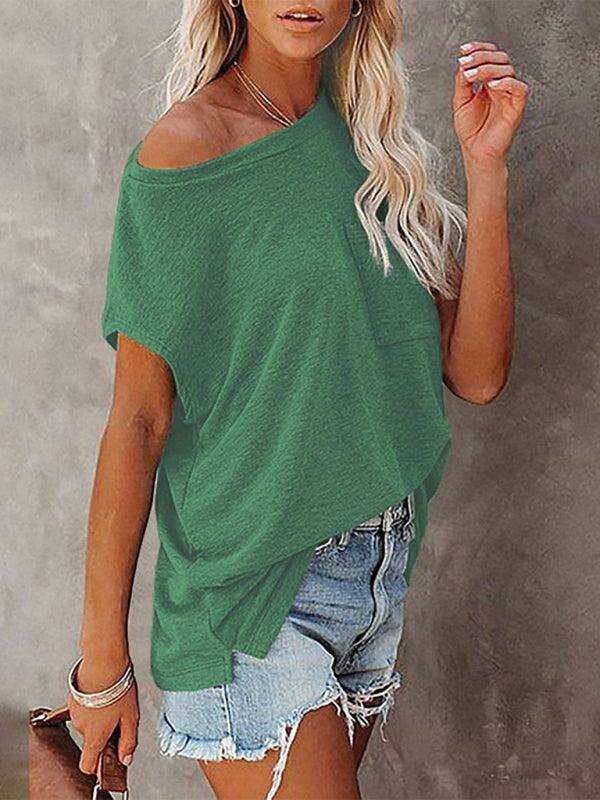 Embrace effortless style and comfort with our Chic Off-Shoulder Pocket Top. This trendy solid color round neck tee is the perfect addition to your wardrobe, effortlessly combining fashion with functionality.
