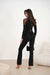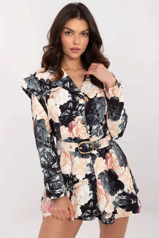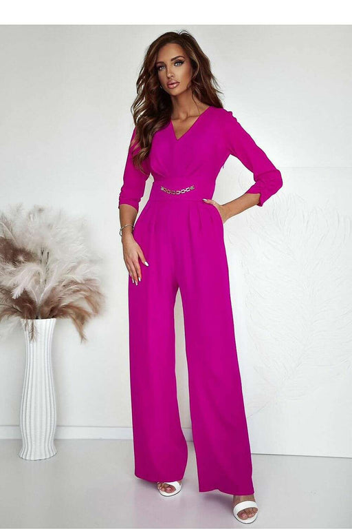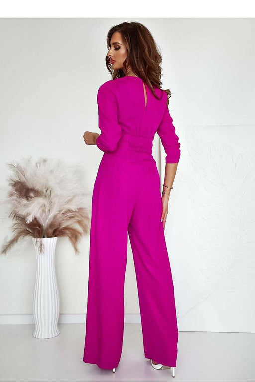 An elegant women's jumpsuit is a unique proposal combining classic style with modern design. Made of high-quality material, it perfectly fits the silhouette, emphasizing its assets. The long sleeves decorated with subtle buttons add chic, while slightly flared trousers at the bottom give the outfit a touch of lightness and elegance. There is a decorative belt with elastic at the waist, which emphasizes the waist and ensures a perfect fit. At the front, there is a practical zipper closure, adding a modern character. Flesh-colored inserts on the shoulders create a subtle lightness effect and add a unique, sensual accent to the jumpsuit. It is a perfect choice for evening outings, elegant meetings, or special occasions where style and a unique appearance matter.