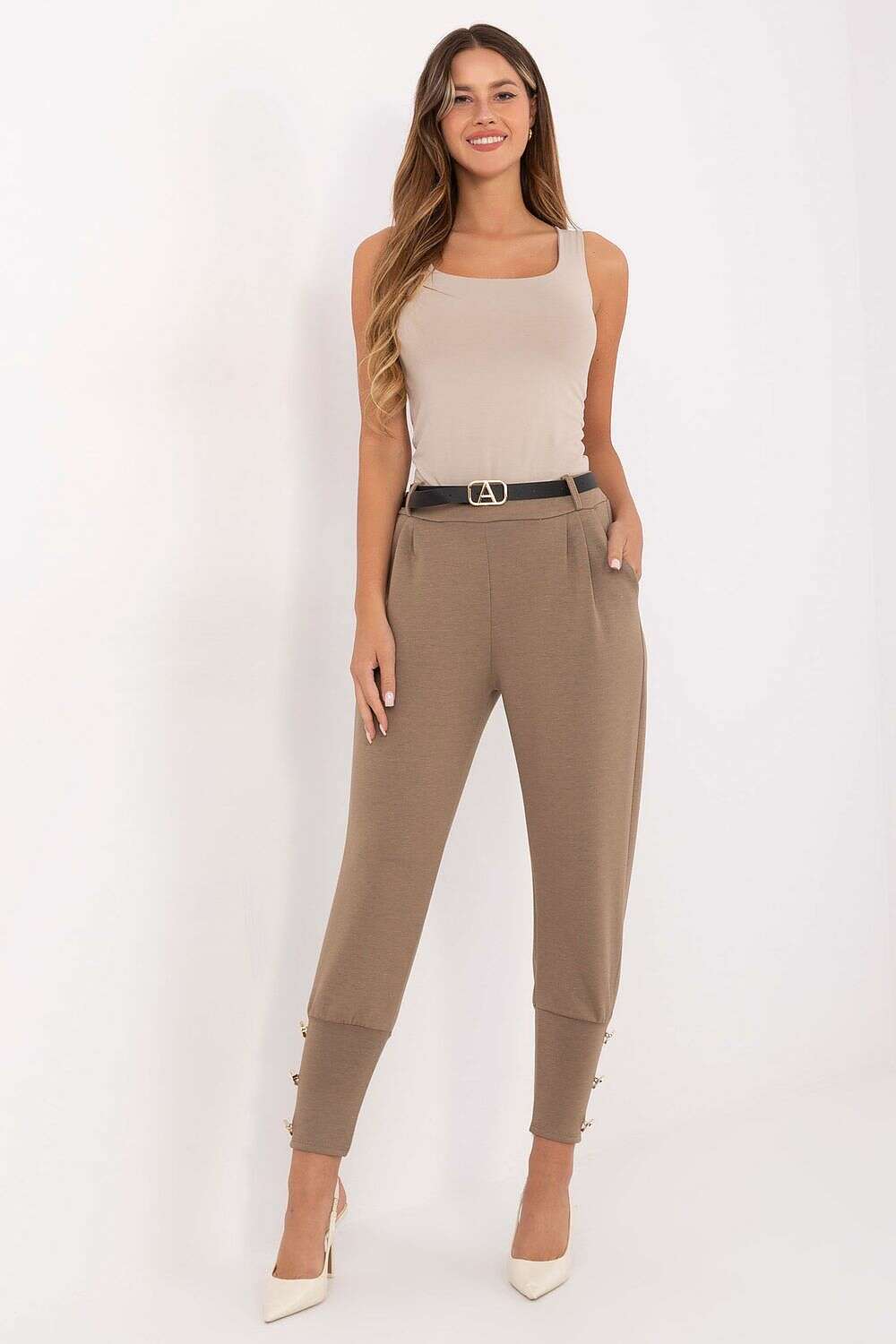 Attention to detail is evident in the wide cuffs with decorative buttons at the bottom of the legs, giving the trousers a chic, urban finish. This is an excellent choice for women who value the harmony of comfort and city-ready elegance, whether you’re at work, out for a walk, or meeting friends.