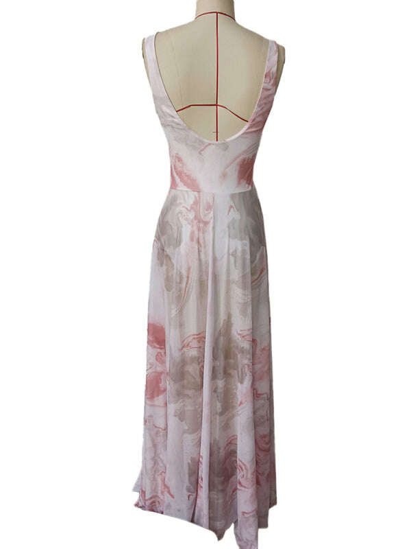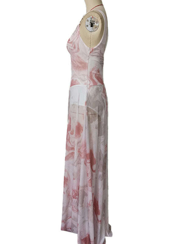 V-neck suspenders mesh print semi-transparent V-neck long dress