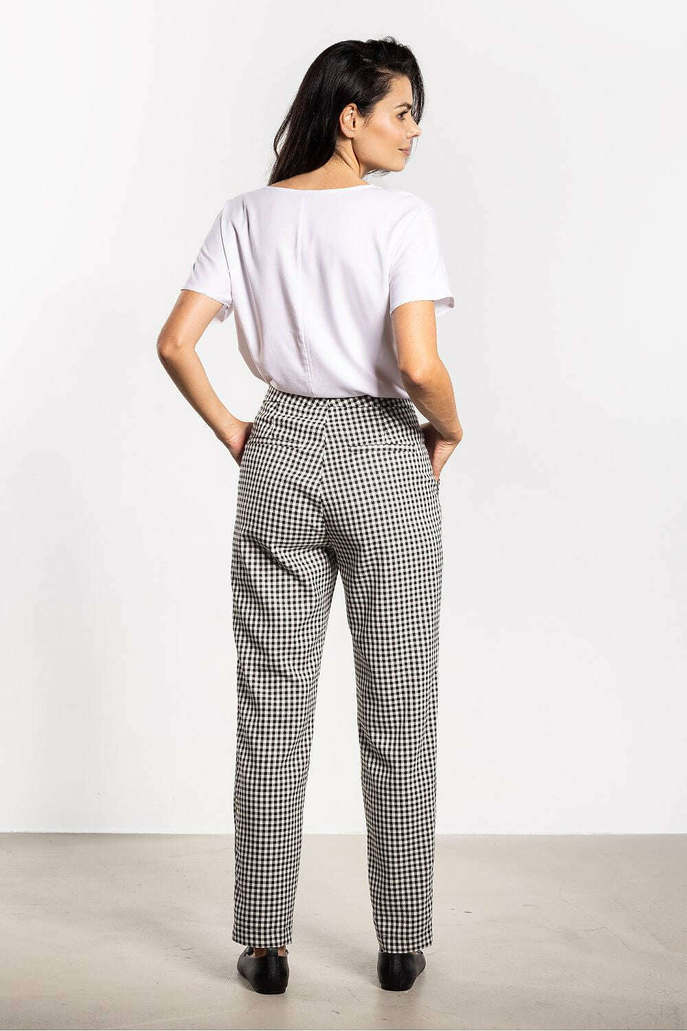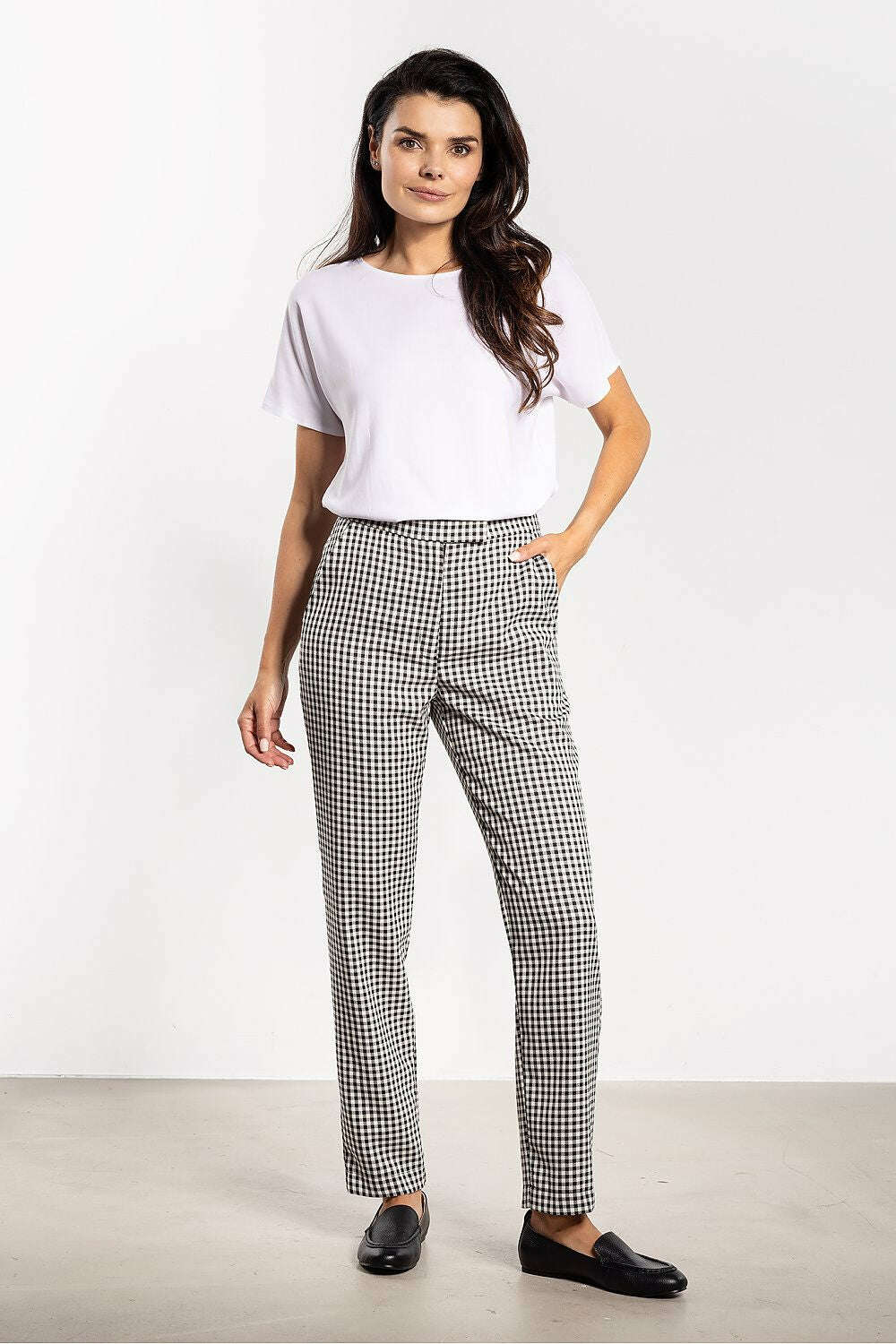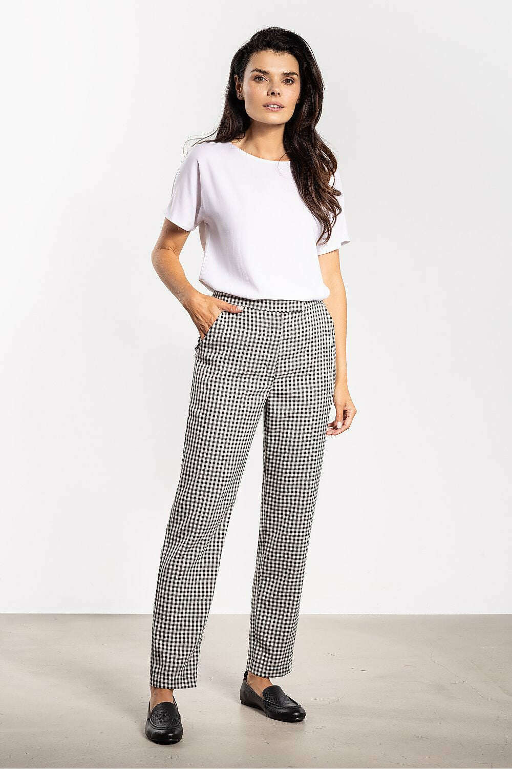 Elevate your workwear with Women’s Cigarette Pants in a timeless checkered pattern. This slim, cigarette-style pant is designed to skim the silhouette with a mid-rise waist for comfort all day long. The classic check adds a refined touch, making these pants ready for the office, meetings, and after-hours styling.
