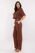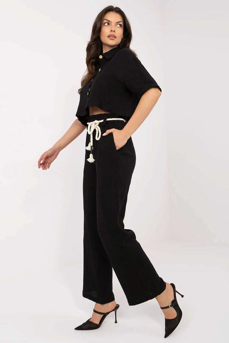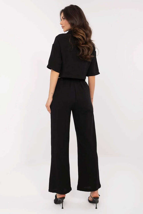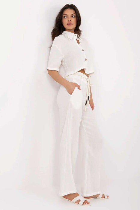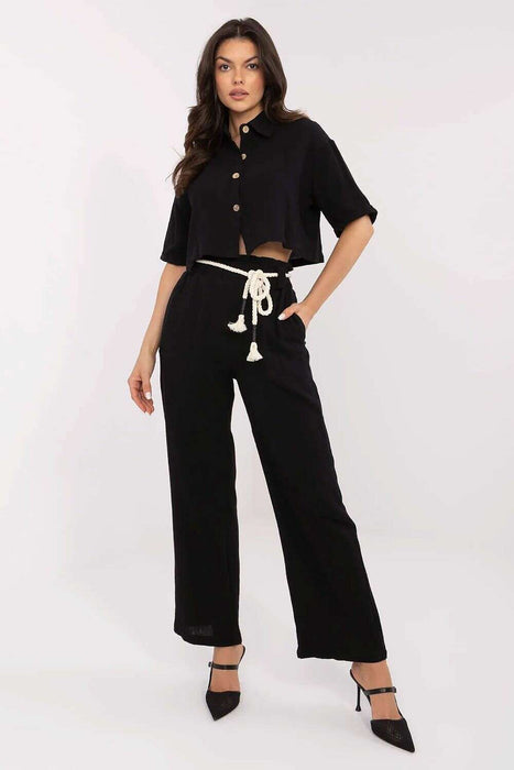 The women's set with a shirt and trousers is a stylish and comfortable proposition in a casual version, perfect for everyday wear. Made of breathable and natural blend of linen and viscose, it ensures comfort even on warmer days. The set includes a short-sleeved shirt with a classic collar and button fastening, which looks light and timeless. The high-waisted trousers with straight legs are equipped with side pockets and a waist tie that accentuates the silhouette and adds a feminine touch. The smooth fabric and minimalist cut make the set extremely versatile, perfect for a walk, shopping or a casual day at work. A natural look and relaxation in a trendy version!
