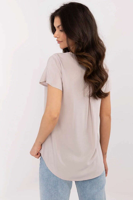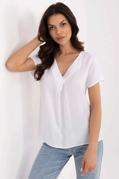 Light and comfortable blouse with a casual character, perfect for everyday outings. Made of breathable and soft viscose, it ensures comfort throughout the day, even on warmer days. A model of standard length, with short sleeves and a feminine V-neckline, subtly accentuates the silhouette and fits many stylizations, both with pants and skirts. Smooth material gives it a universal character, which can be easily paired with favorite accessories. It is an ideal base for simple, stylish, and comfortable everyday outfits.