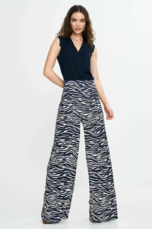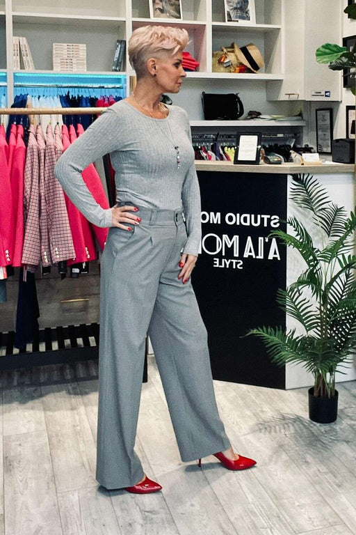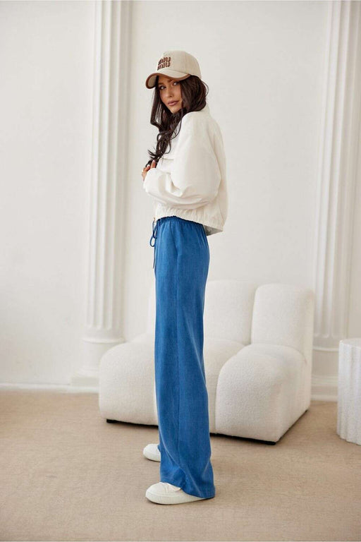 Women's pants with long legs. Tied high waist top and long, wide legs. The pants have side, open pockets and an elastic band at the waist.