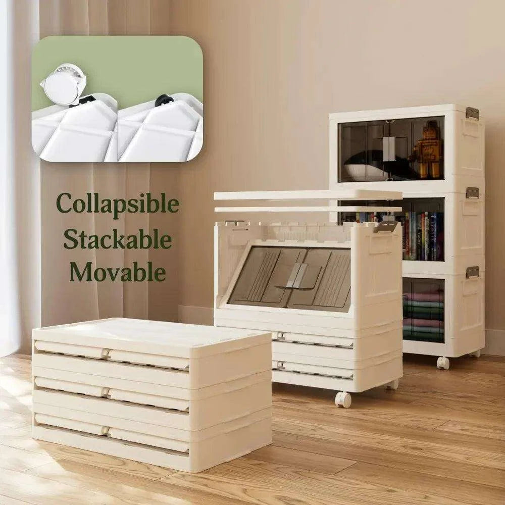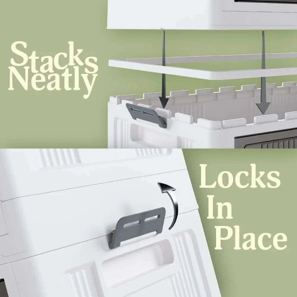 - Foldable, Stackable, and Mobile: Easily foldable and stackable with special grooves, equipped with four rotating wheels for effortless mobility.