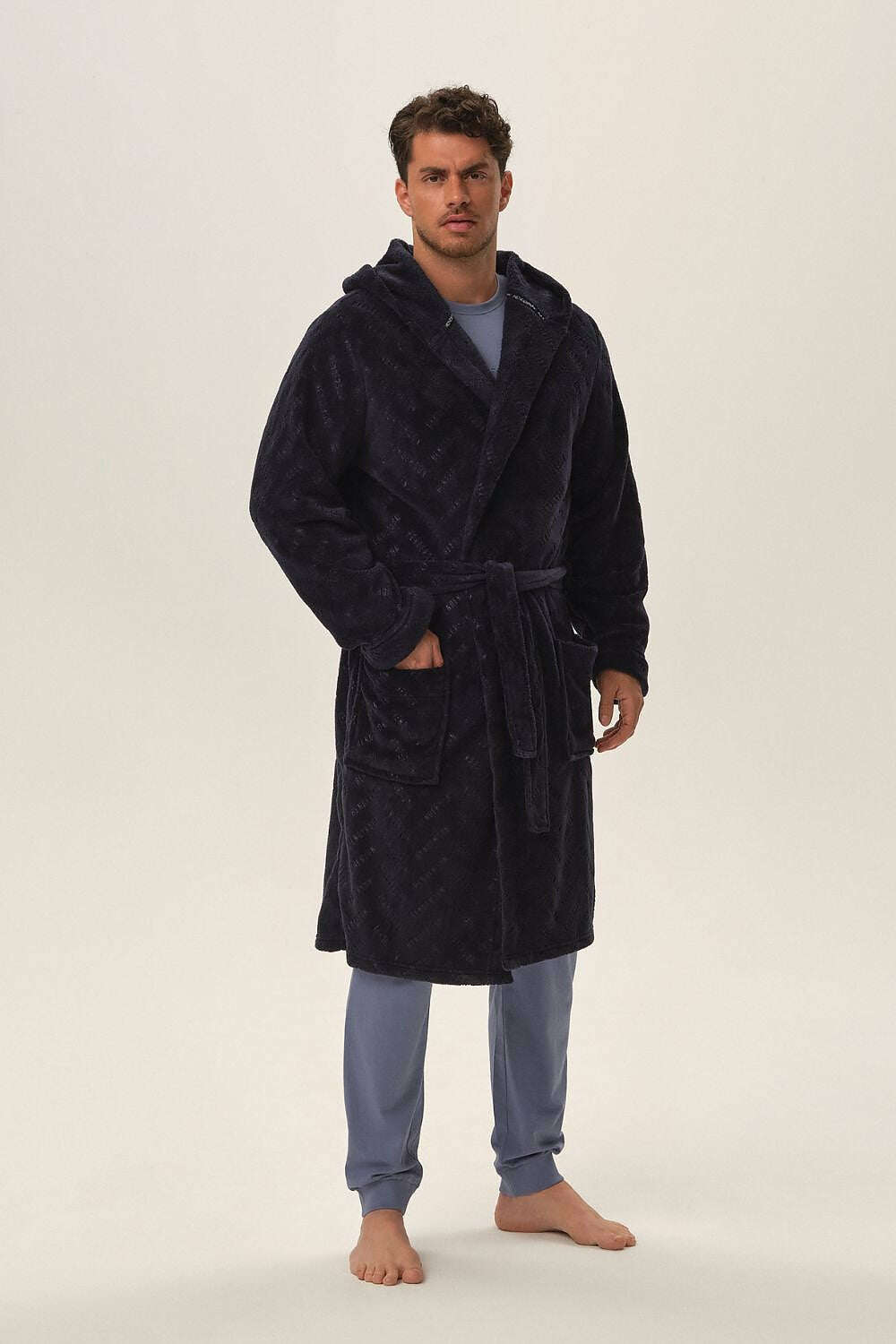 Warm, meaty Hacker bathrobe in a dark navy shade is a stylish proposition for cooler mornings and evenings. Cozy, soft material with a designer brand print perfectly absorbs moisture and allows you to comfortably relax after a bath, pool or sauna. You can put on a loose hood on wet hair, and practical tie at the waist and rolled up cuffs allow you to wrap yourself up to the neck.
