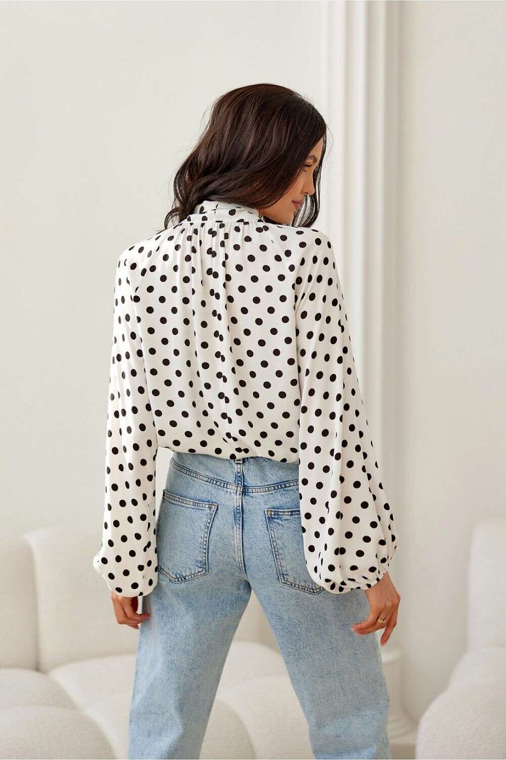 Blouse with long, puffy sleeves finished with an elastic band. It has a decorative tie at the neckline.