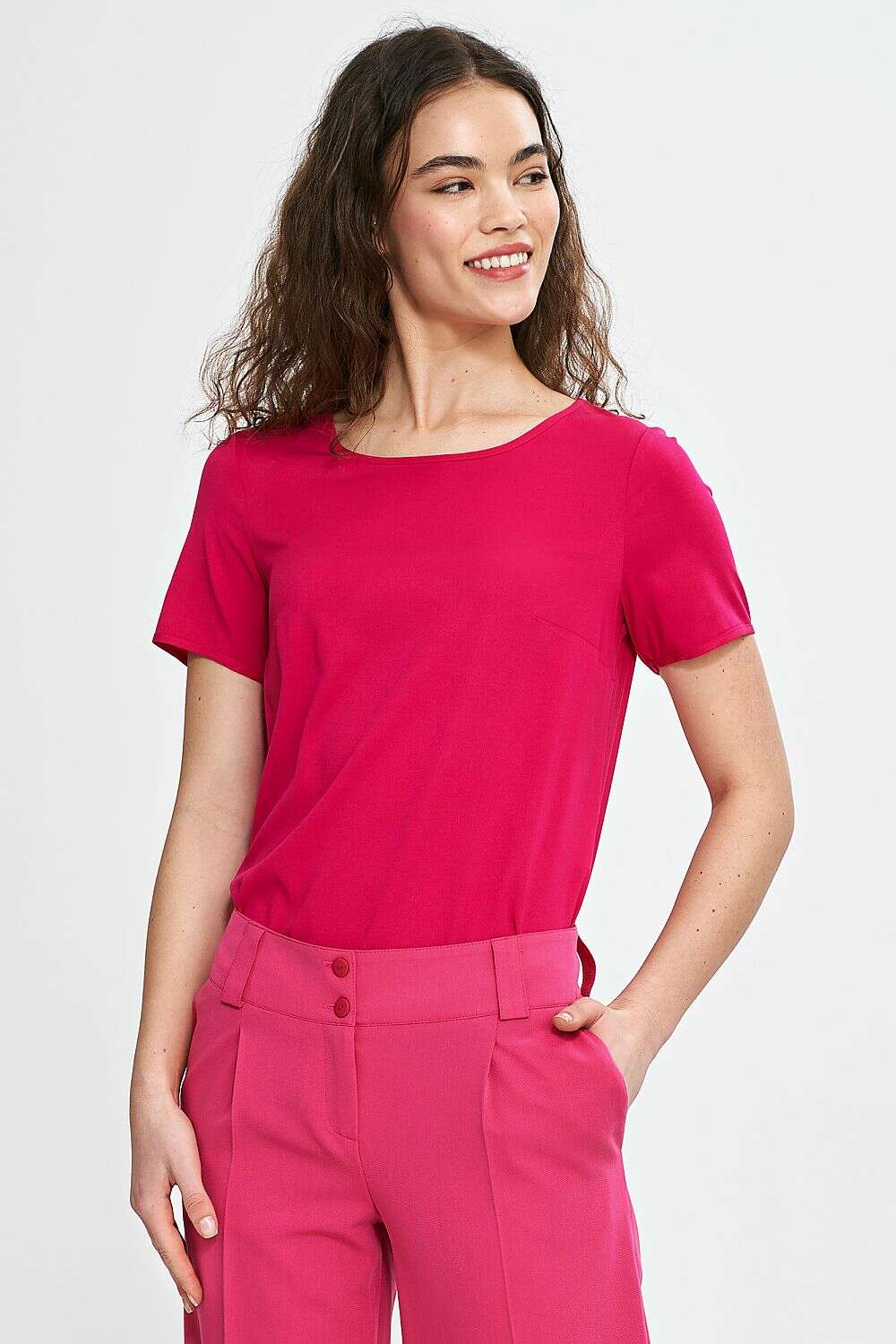 Simple and universal blouse with a regular cut, perfect as a base for everyday styling. Made of soft, breathable viscose, which gently drapes on the silhouette and ensures comfort when worn. The model features a boat neckline and short sleeves finished with a subtle trim. The blouse is designed to be slipped on over the head.
