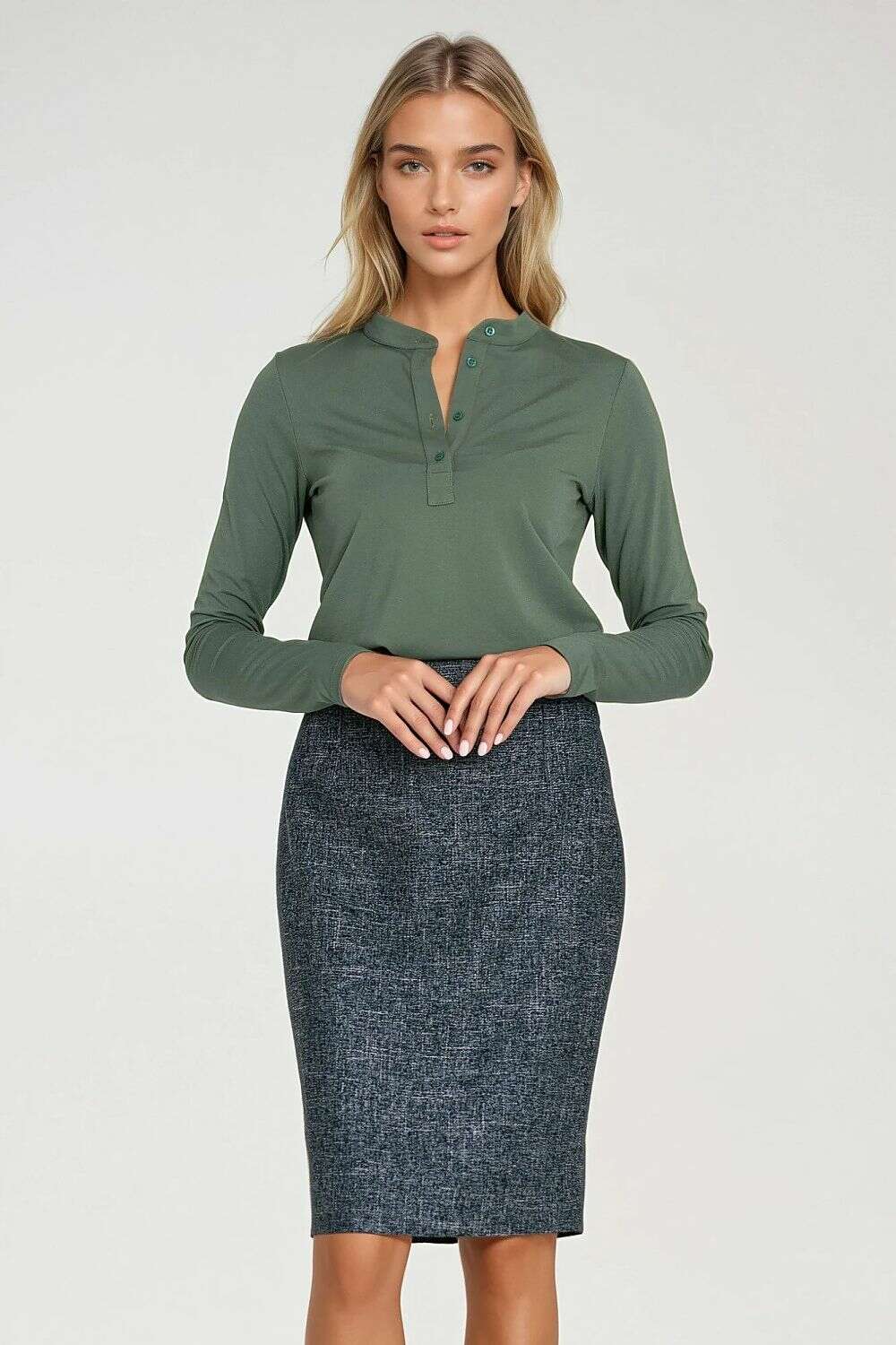 Elevate your everyday look with the Stretchy Women Blouse With Spandex Polo Collar Long Sleeves. This fitted blouse hugs your silhouette while the flexible fabric moves with you for all-day comfort. A sporty elegant vibe comes from the polo neck with a stand-up collar and long sleeves. The halfway-buttoned placket lets you adjust the neckline depth to suit any occasion, from casual coffee runs to relaxed office days. Its versatile cut pairs beautifully with denim, skirts, or tailored trousers for a polished, effortless style.