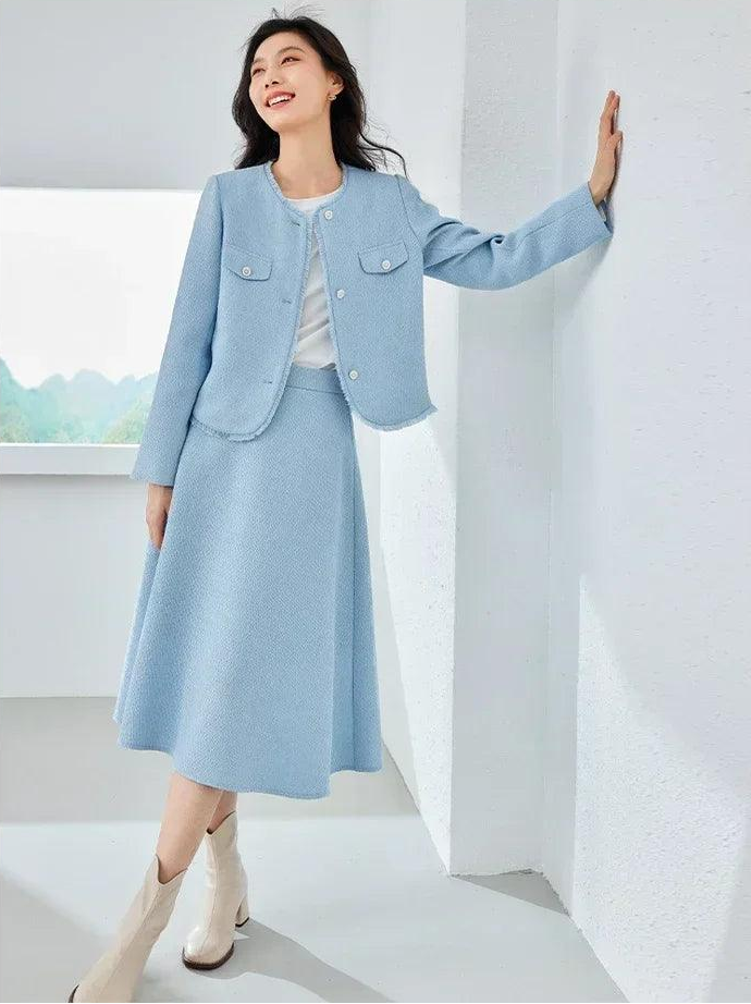 Step into the season with elegance and flair with the Stylish Blue Tweed 2-Piece Women's Suit. This exquisite ensemble is tailored for the modern woman who values both comfort and style, making it the perfect choice for a variety of occasions.